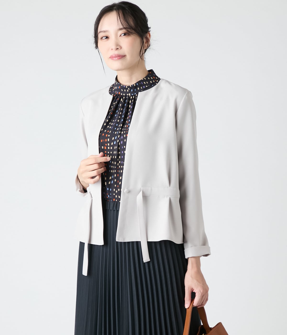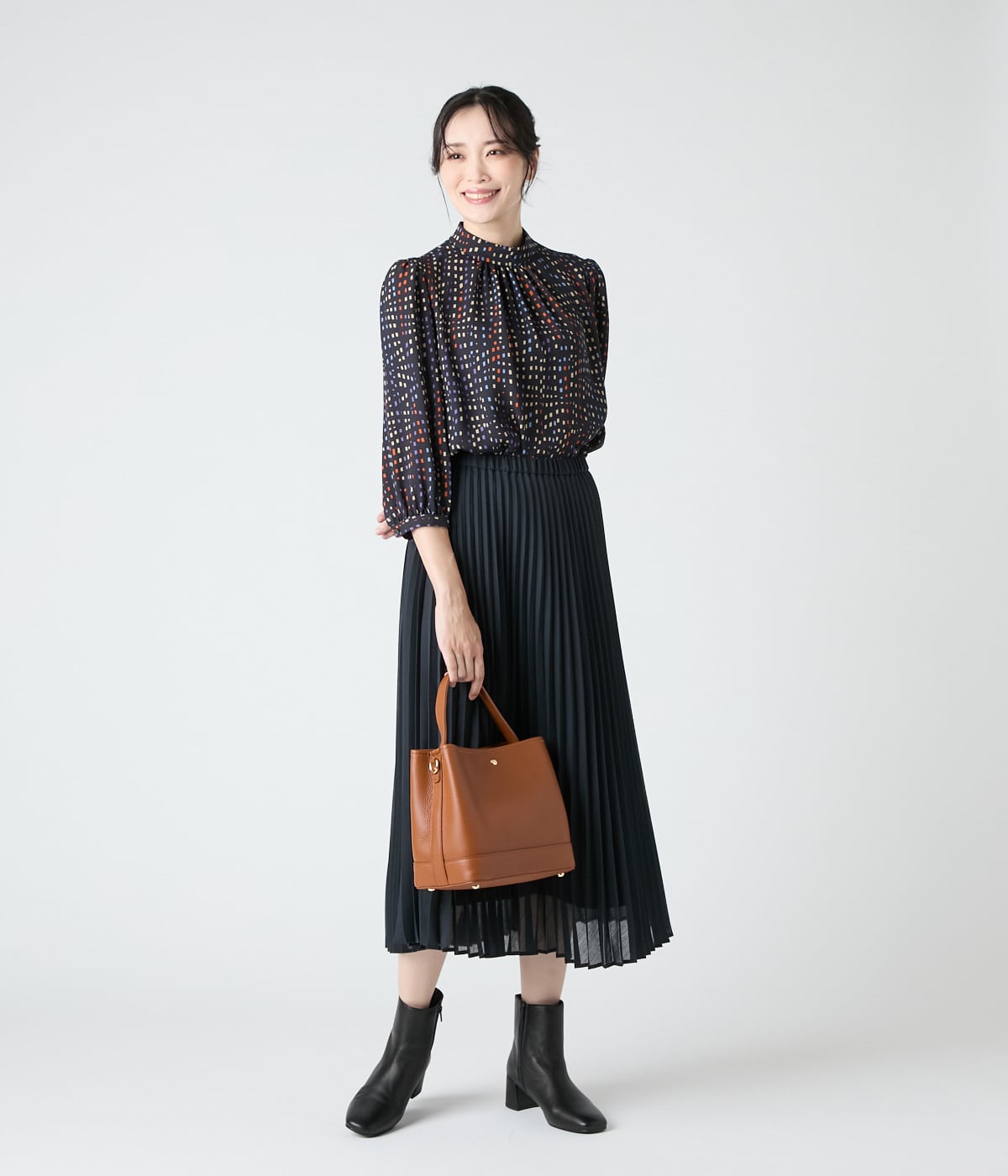 ハイネックの長袖ブラウス。ネック部分にあしらったギャザーが、顔周りにアクセントを添えてくれます。袖口にもギャザーを配し、ふんわりと柔らかな雰囲気に仕上げました。ジャケットのインナーとしても華やかに映えるデザインです。