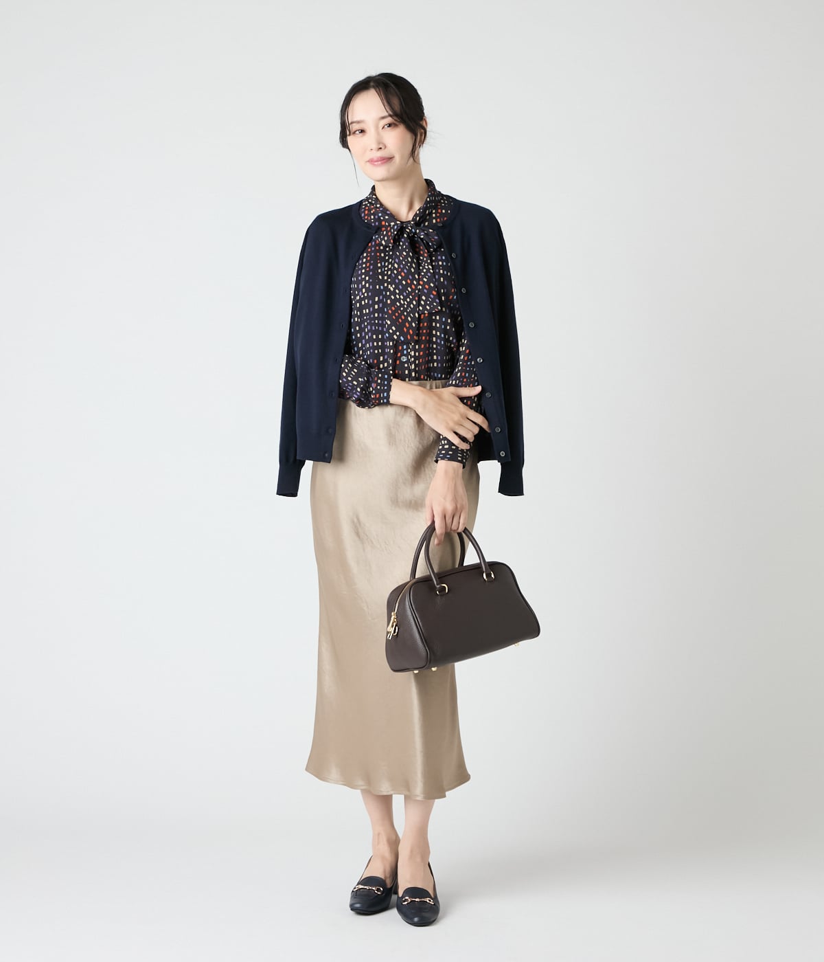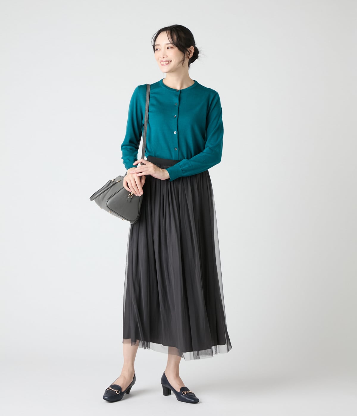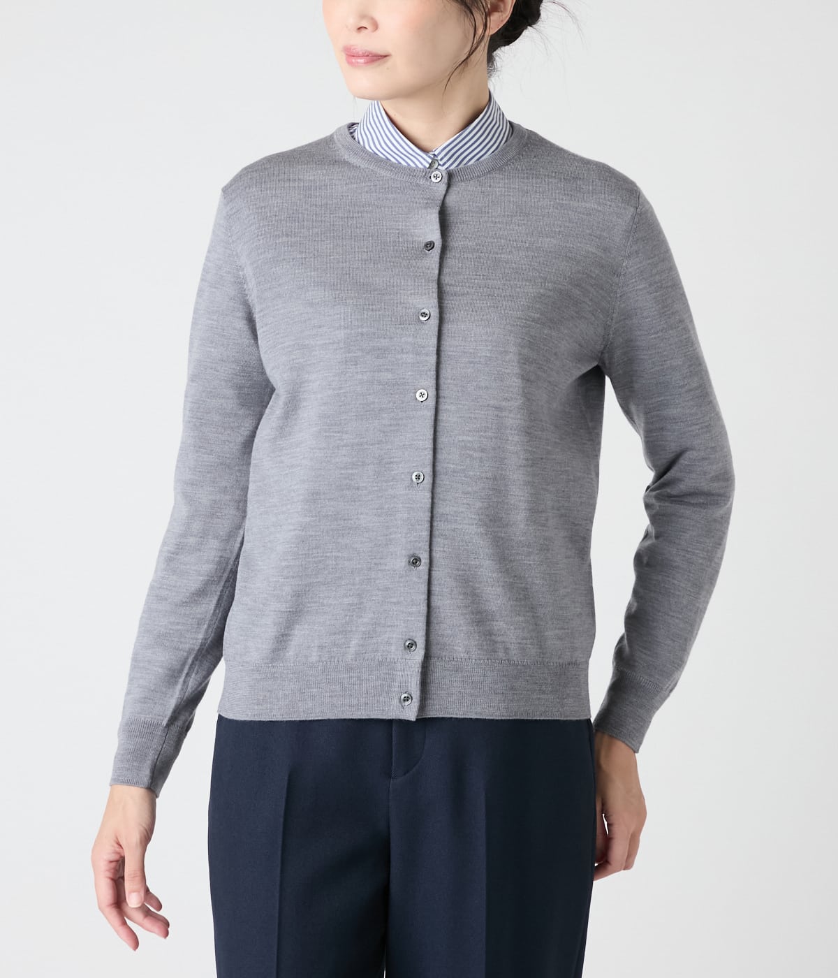 シンプルで着回しやすい、定番のクルーネックカーディガン。すっきりとしたシルエットに袖口と裾をリブで引き締めた、上品なカジュアル感が魅力的。どんなコーディネートにも馴染む、洗練されたアイテムです。