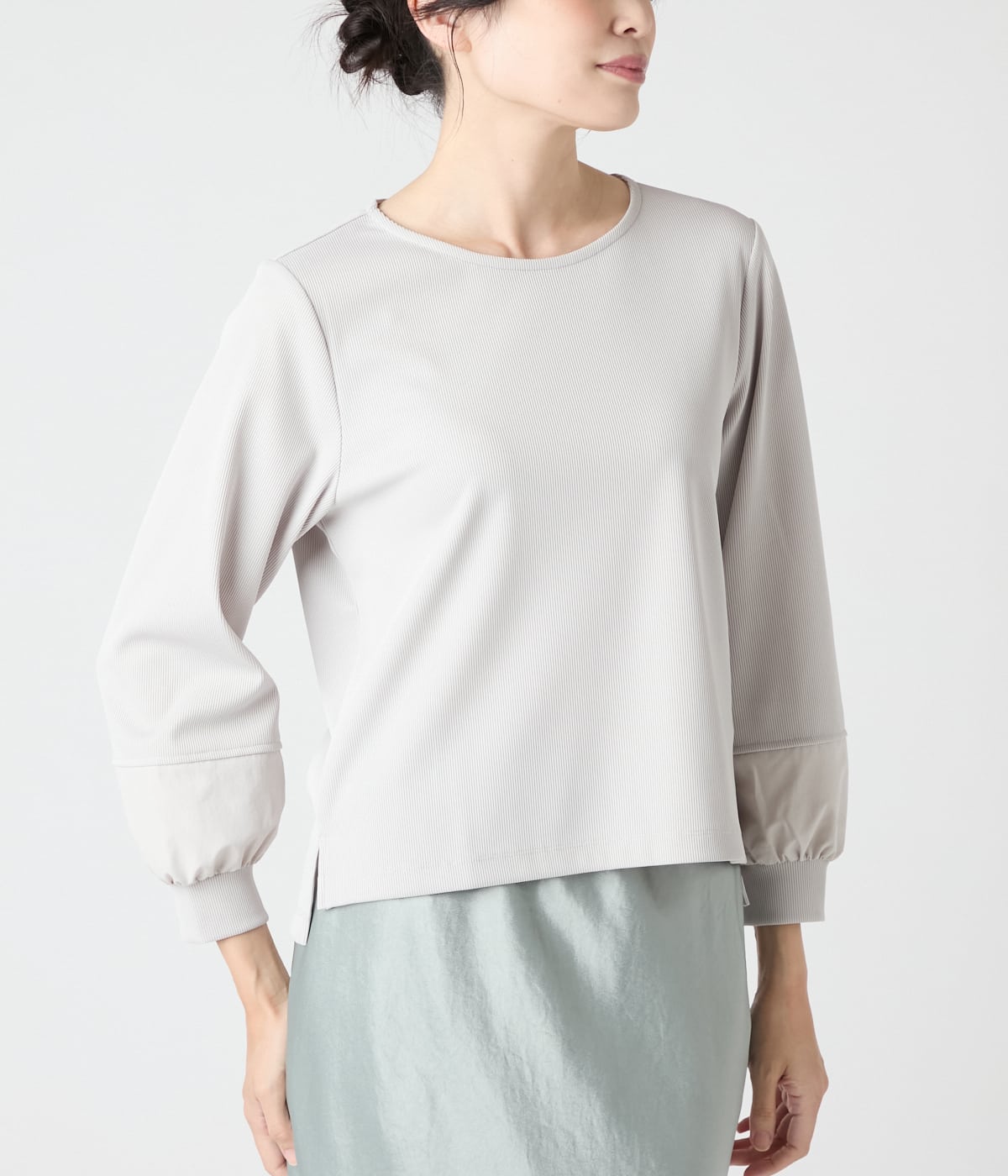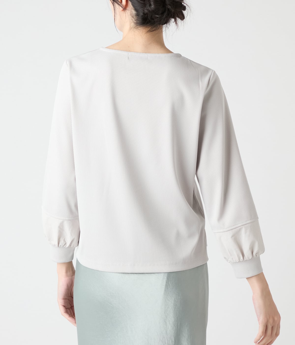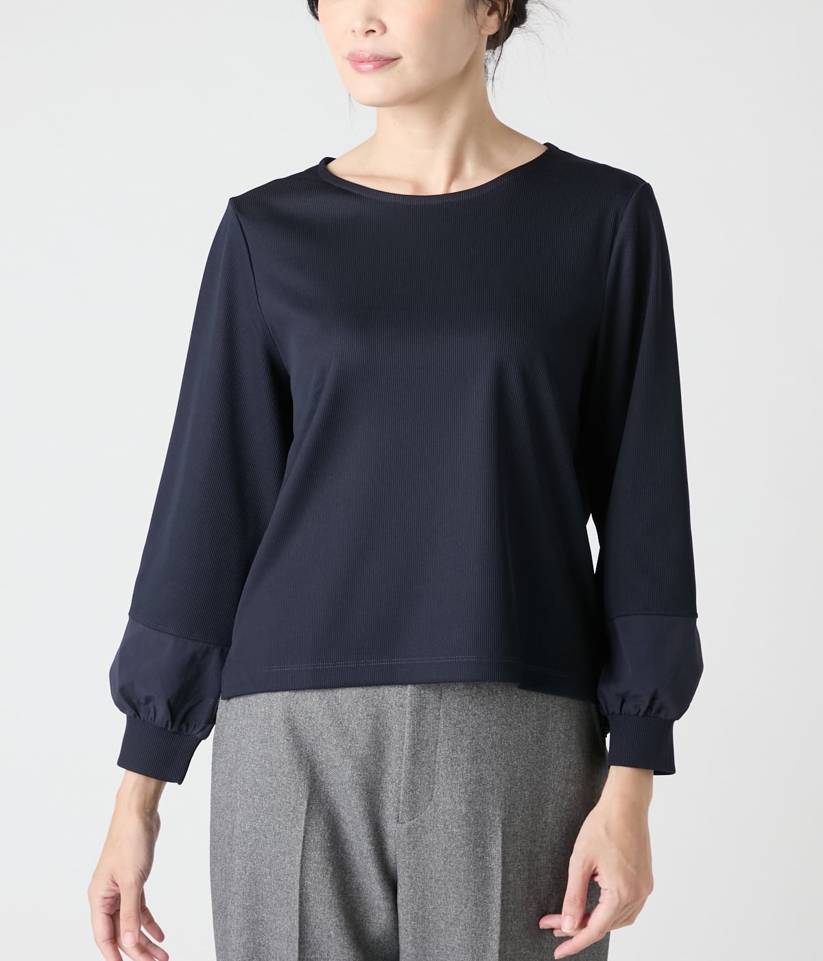 身頃から袖にかけて施された縦ラインのリブ編みが、すっきりとした印象を演出。袖口は別素材で切り替えたさりげないアクセントがポイント。トレンド感のあるパフスリーブデザインながら、程よく抑えたボリュームで、アウターのインにもすっきりと収まります。