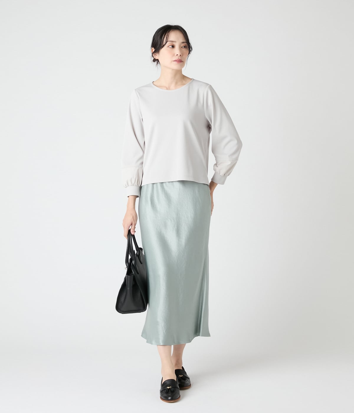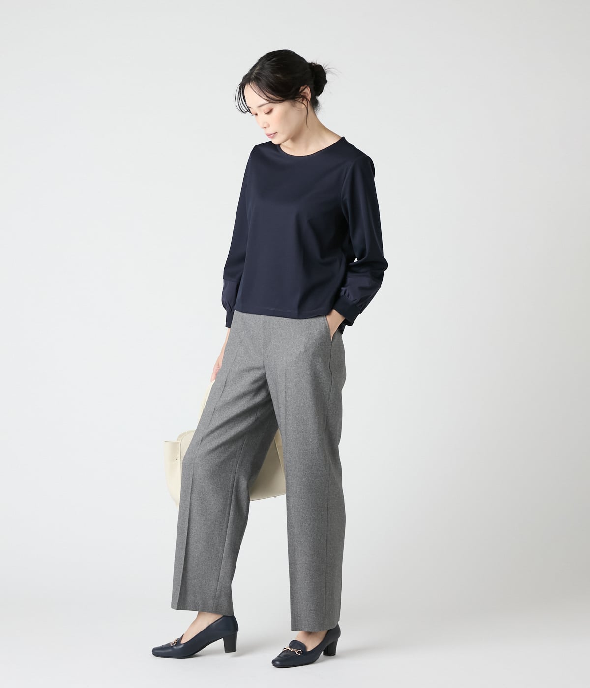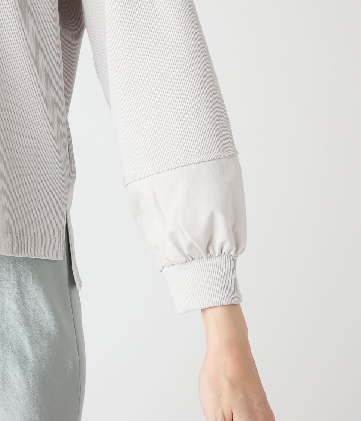 身頃から袖にかけて施された縦ラインのリブ編みが、すっきりとした印象を演出。袖口は別素材で切り替えたさりげないアクセントがポイント。トレンド感のあるパフスリーブデザインながら、程よく抑えたボリュームで、アウターのインにもすっきりと収まります。