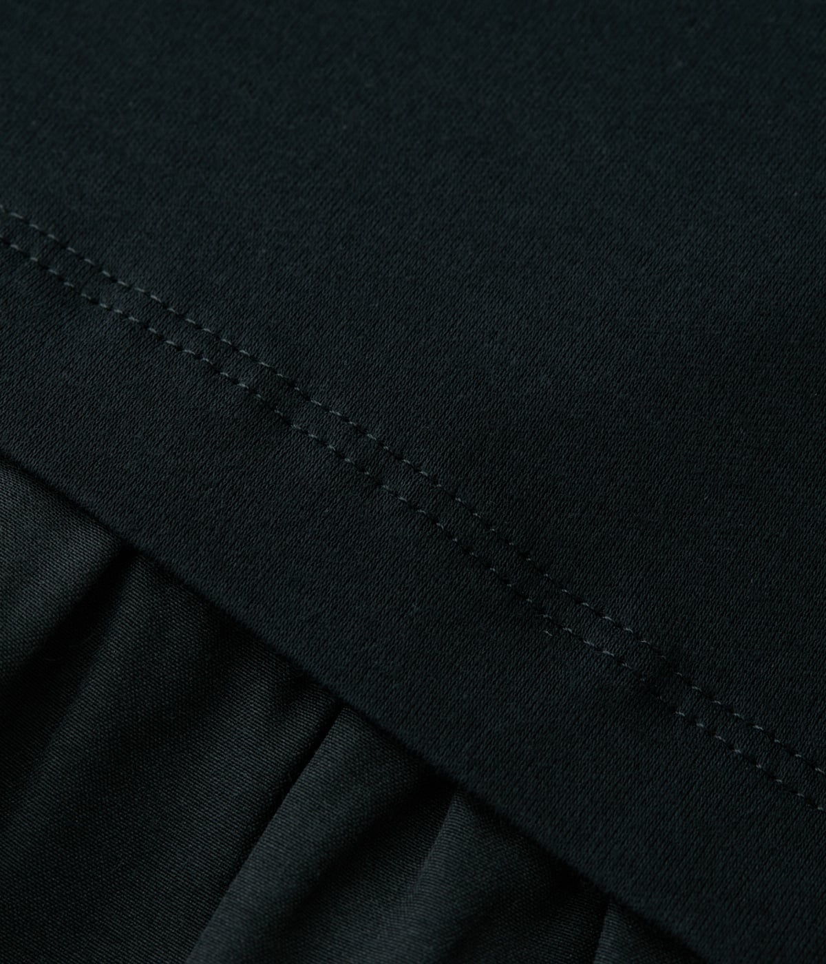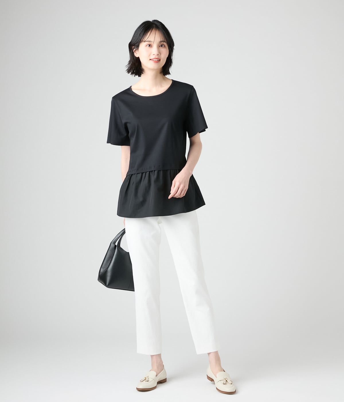 裾がペプラム型になっているデザイン性抜群な半袖カットソープルオーバー。身頃下部分を布帛で切り替えたメリハリのあるシルエットに仕上げました。やや長めの丈はテーパードパンツとの組み合わせがおすすめ。