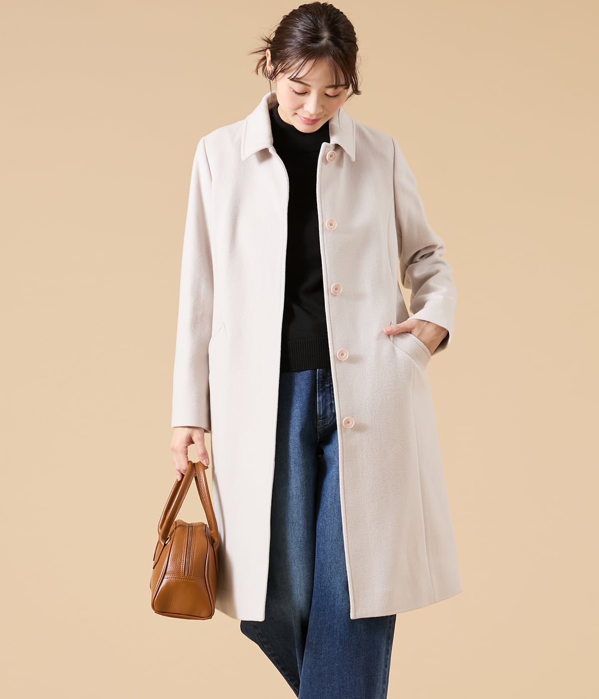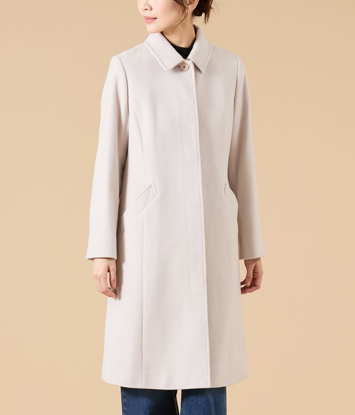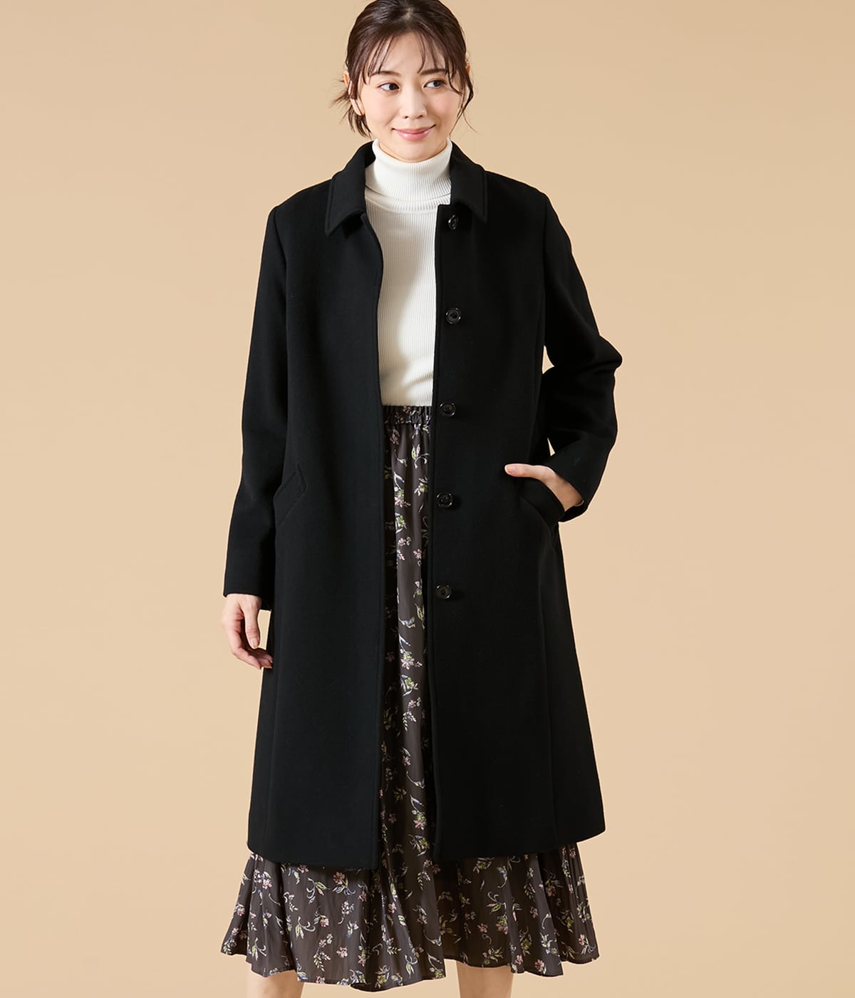 ベーシックなステンカラーコート。ビジネスや冠婚葬祭など、様々なシーンに活躍する1着です。上品な雰囲気を演出する、小ぶりな襟もポイント。裏地あり。ポケットあり。