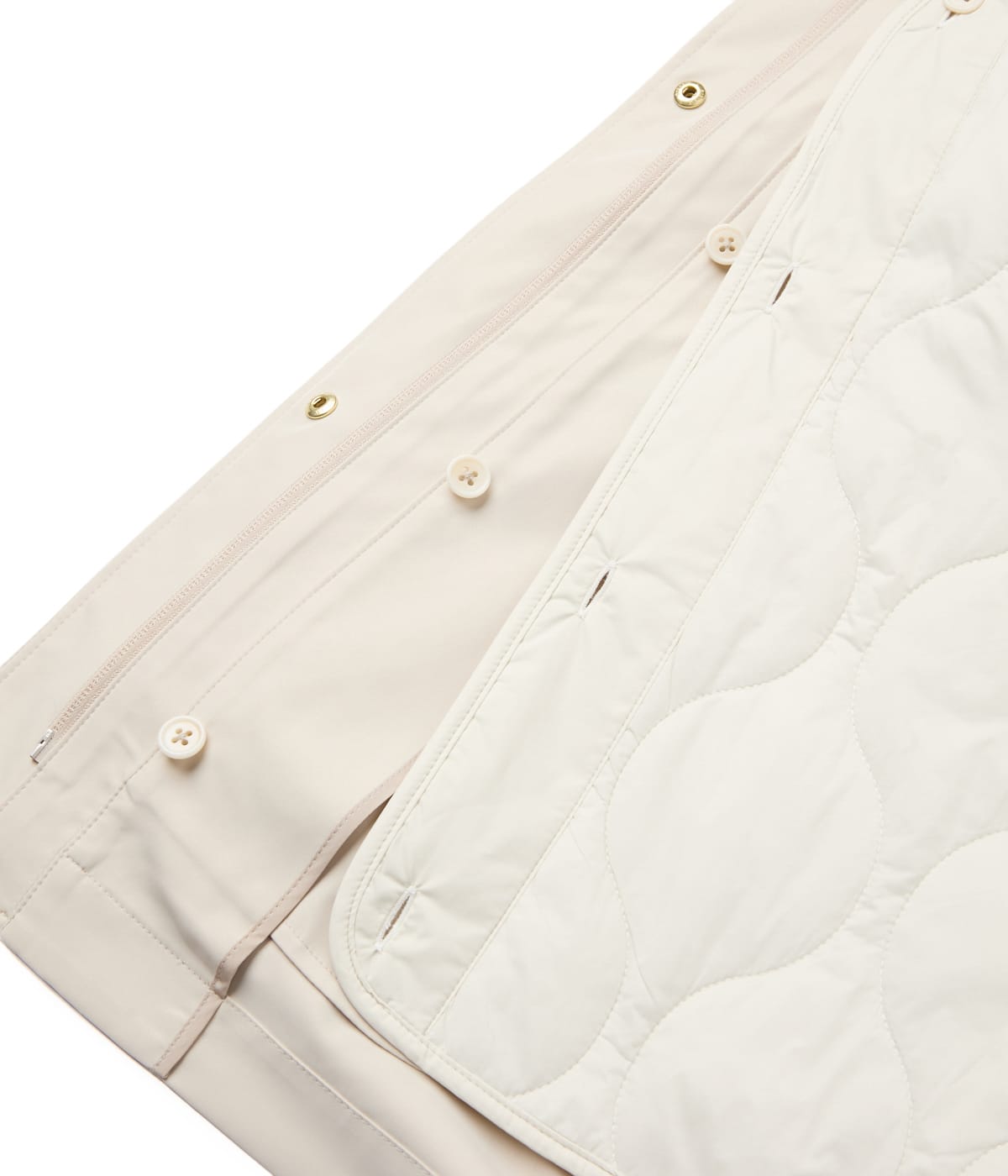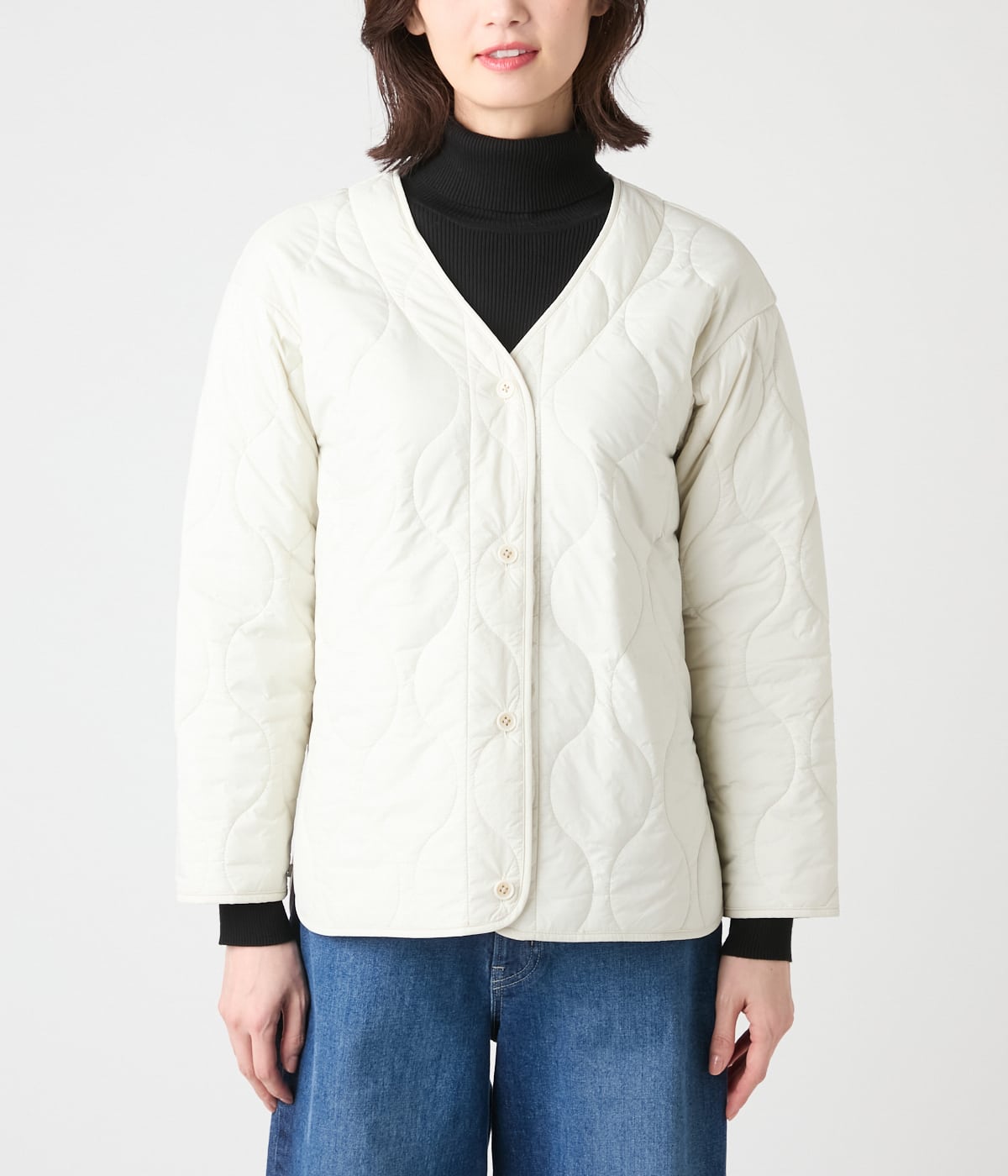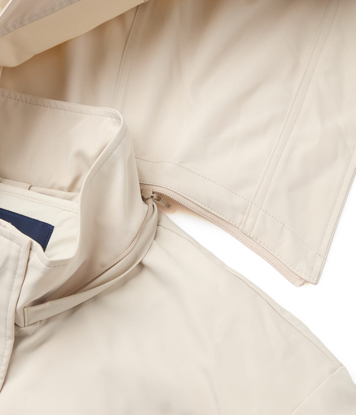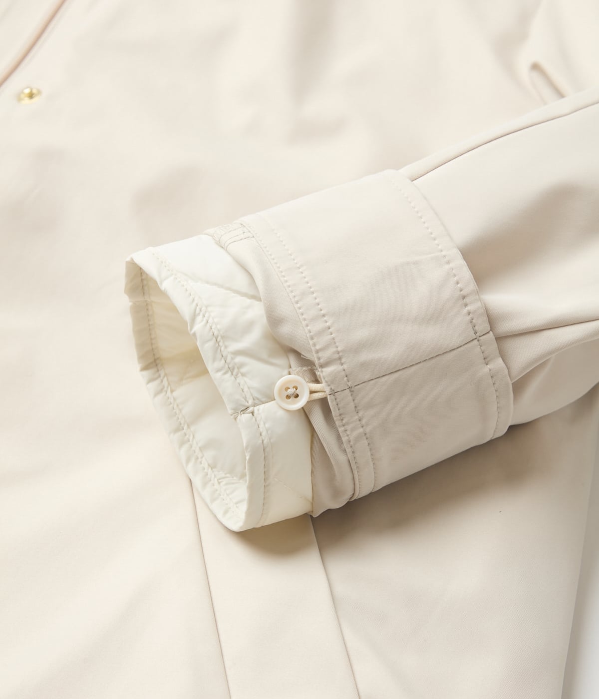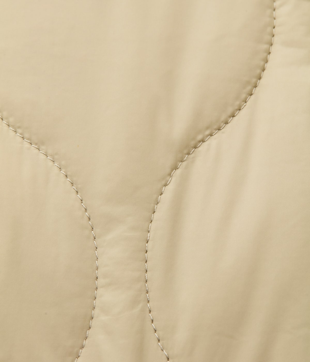 本体は、シワになりにくく、軽やかで扱いやすいポリエステルツイル素材を使用。ライナーには、軽くて暖かいキルティング加工生地を使用しました。また、ご自宅で手洗いが可能です。