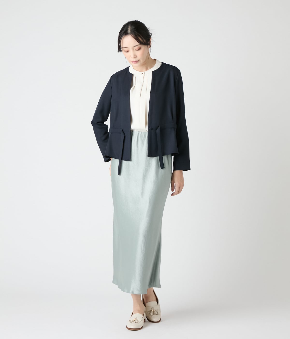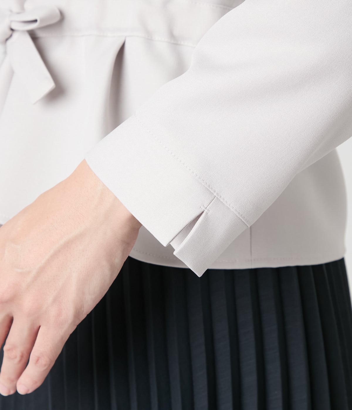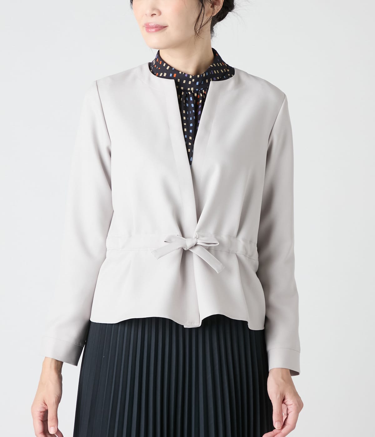 さらっと羽織るだけで、ジャケットのようなきちんと感を演出する変形ブラウス。しっとりとした肌触りと上品なマット感が秋冬のスタイリングを品よく彩ります。ドローストリングでウエストマークすれば、すっきりとメリハリのあるシルエットに。カラーはナチュラルなグレージュ、シックに決まるネイビーの2色展開。