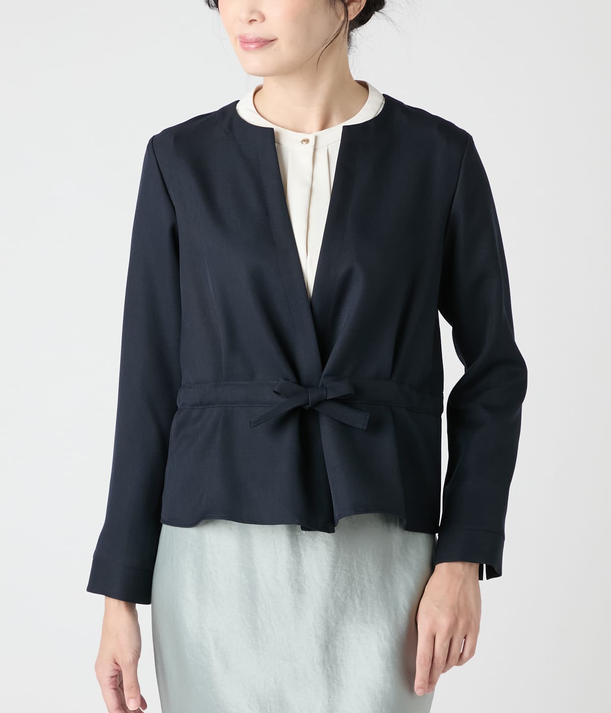 ジャケット感覚でさらりと羽織れる変形ブラウス。ウエストラインにドローストリングを配し、絞ることでシルエット変化をお楽しみいただけます。ドローストリングは前でリボン結びをしたり、ラフに羽織る時は端を片結びして垂らしたりと、着こなしのアクセントとしても活躍。袖口はスリット入りで、折り返して軽さを出すのもおすすめです。フロントのボタンに使用したくるみボタンもさりげないポイントです。裏地なし。ポケットなし。