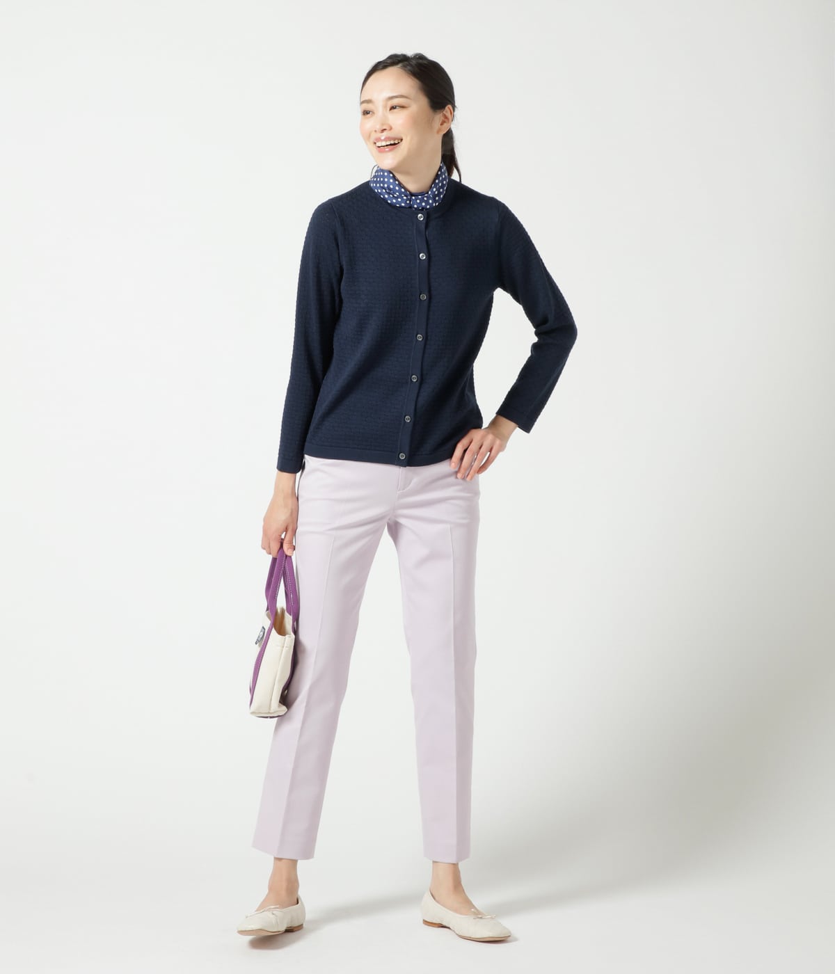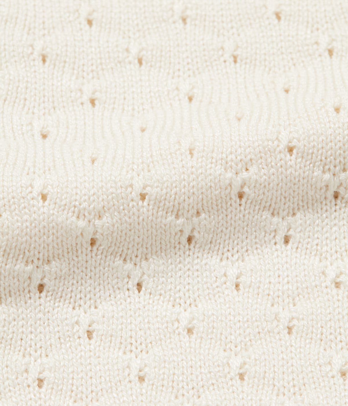 レーヨンとポリエステルを複合したストレッチヤーンを使用。肌触りの良さと上品な微光沢が特徴の素材です。格子状に並んだアイレット柄は立体的で膨らみがあり、寒さの残る時期からお召しいただけます。目が詰まっているため、透けが気になりにくいのもポイント。また、ご自宅で手洗いが可能です。
