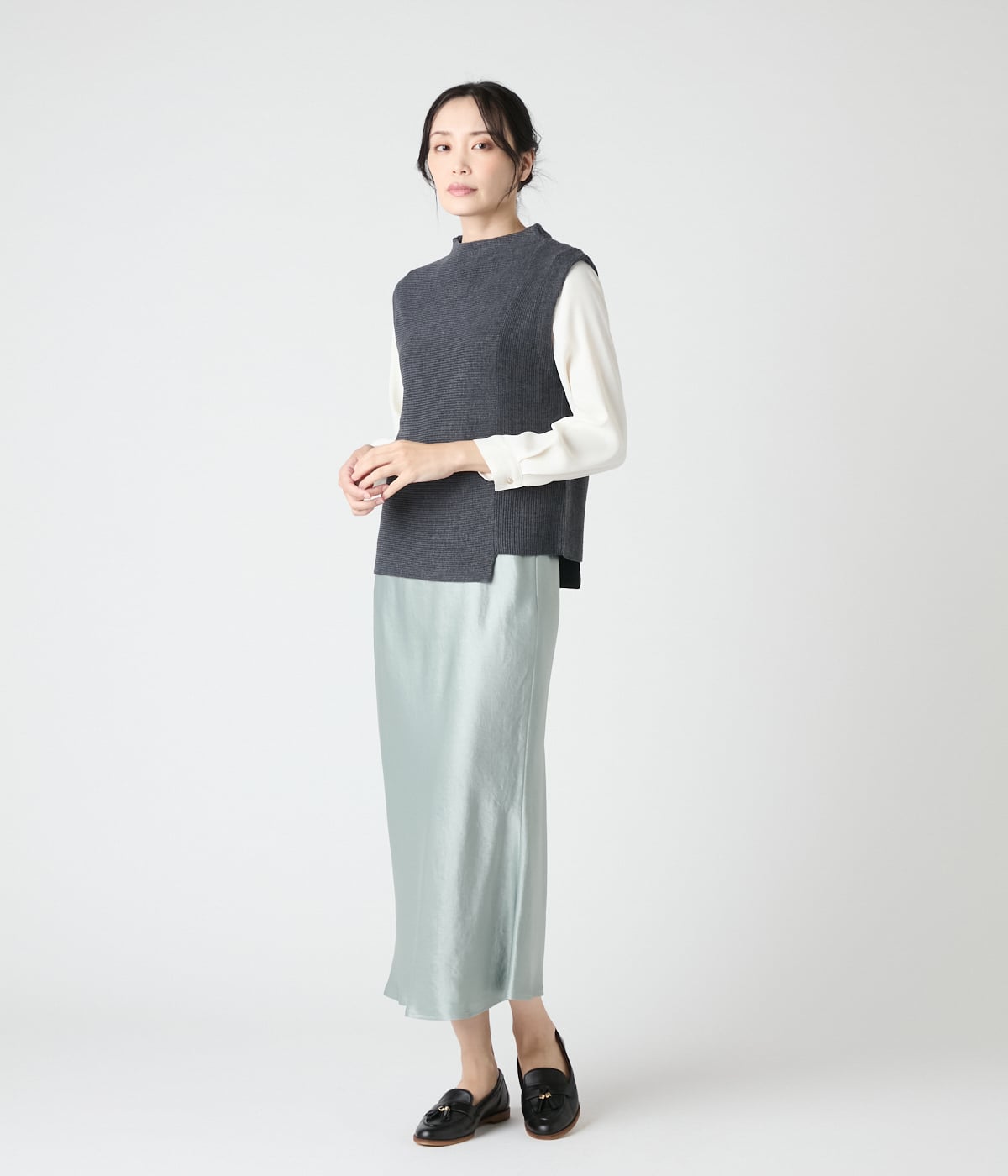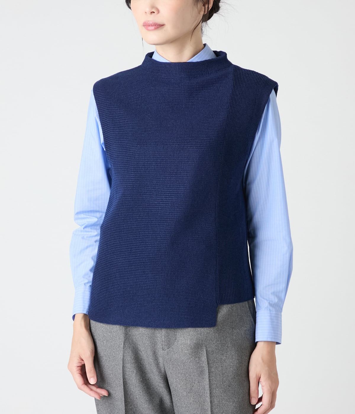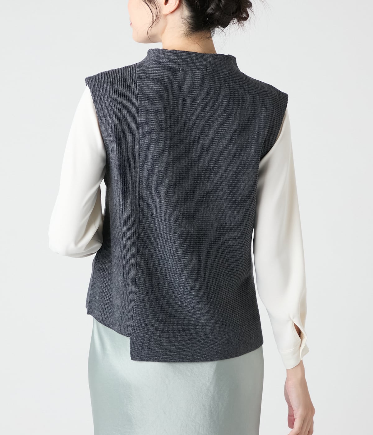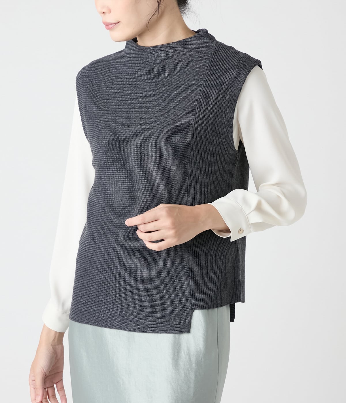 左サイドの縦地と横地の切り替えが特徴のニットベスト。裾に左右差のあるアシンメトリーなデザインで、洗練された着こなしが叶います。襟が高すぎないモックネックもポイントで、シャツやタートルネックトップスとのレイヤードをお楽しみいただけます。