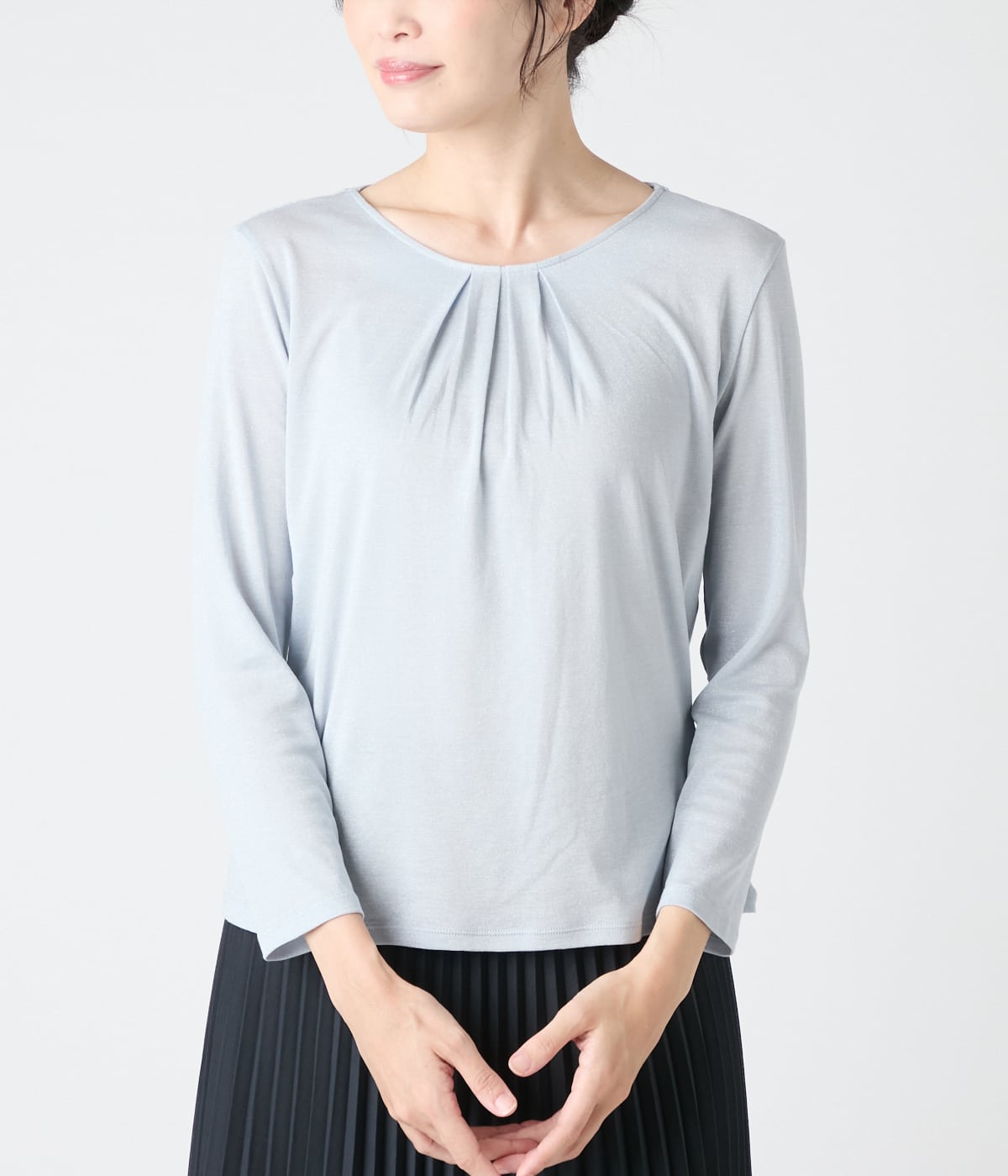 着回しやすさと上品なルックスを兼ね備えた、フロントタックプルオーバー。1枚着からジャケットのインナーなど着回しいただけます。カラーはシーズン問わず活躍するライトグレー、華やぎのあるサックスの2色展開。