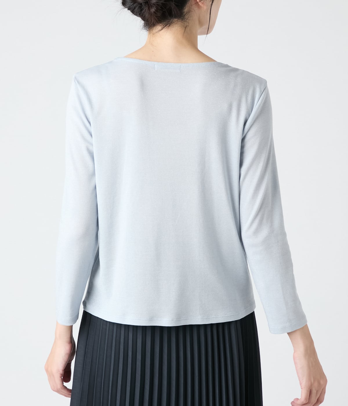 柔らかく伸びのあるフライス素材に、ラメ糸を織り交ぜて上品なきらめきをプラス。ラメ糸はセルロースとコットン糸を使用し、細くやわらかなラメ糸が交編した、ソフトなタッチに仕上げました。