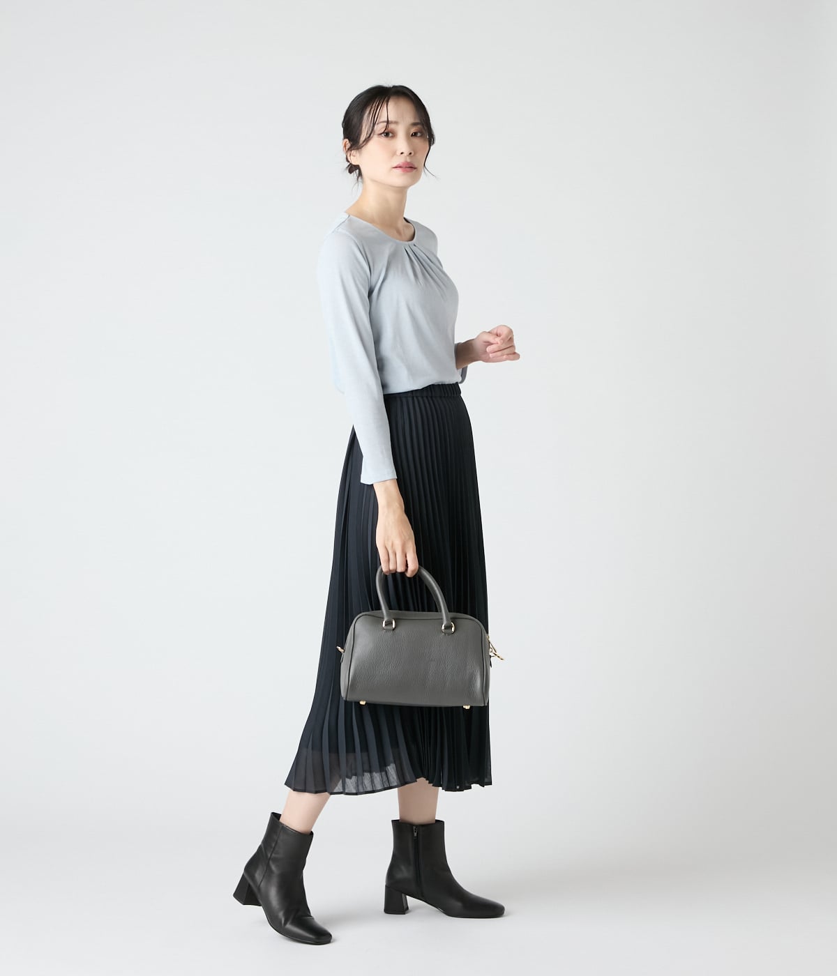 首元のタックがアクセントのクルーネックの8分袖プルオーバー。ほどよい光沢感があり、カジュアルすぎず繊細かつ上品な印象を与えてくれます。