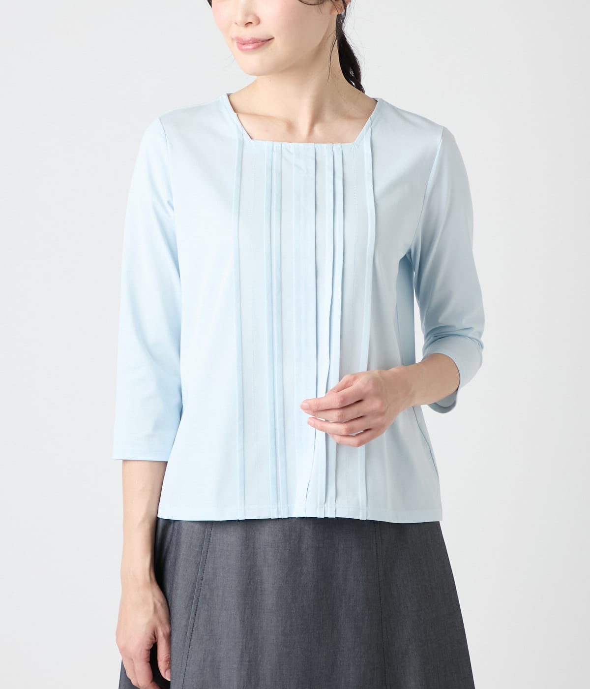 ベーシックな7分袖プルオーバー。フロントに幅の異なるタックを配したことで、ブラウスライクなきちんと感ある印象に。1枚着はもちろん、インナーとしても着映える程よい華やかさが魅力です。