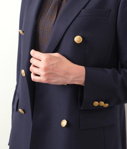4面パネルと胸のダーツで立体的に仕上げたダブルブレストブレザー。程よくゆとりがありながら、高めのゴージラインやピークドラペルがシャープな印象に見せてくれる縦長シルエットです。また、肩増芯をなくし、立体感はそのままに柔らかな仕立てを実現。見返しにはアーカイブコレクションのブレザーを参考に復刻した「The Blazer」の織りネームを配しました。ブレザーのために創られた特別なネームに想いを込め、ブラック×オレンジの色味まで忠実に再現しています。背抜き観音仕立て。袖口本開き仕様。内側に3箇所ポケットあり。脇あて付き。