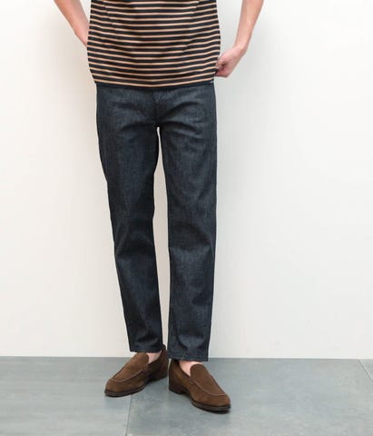 ハリのあるコットンと伸縮性のあるポリウレタンを使用した9オンスのライトウェイトデニム素材。見た目以上にストレッチ性があり長時間穿いていても疲れません。穿きこむほどに味わいのある表情に変化します。