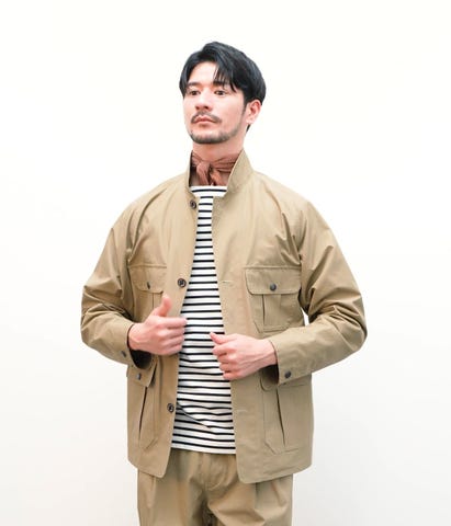 漁師や釣り用にデザインされ多くの人に愛されるようになったフィッシングアウターをベースにしたスタンドカラーアウター。襟を寝かせることで表情の変化を楽しめる2WAY仕様です。前面にはデザイン性だけでなく、収納力のある実用的なフラップポケット、内側には小物の収納に便利なボタン付きポケットを配置。また可動域を広げるラグランスリーブや、肘の曲げやすさを考慮したタックデザインなど、綿素材特有の動きにくさを解消する工夫も凝らされています。ちょっとした時にフックにかけられる襟部分のDカン、ニューヨーカーのロゴ入りボタン、袖部分のアジャスターボタン、背裏のペイズリー柄ニューヨーカータータンと過去のニューヨーカー製品についていた復刻版グリーンネームタグなど着心地だけでなく細部にまで拘りぬかれた1着です。