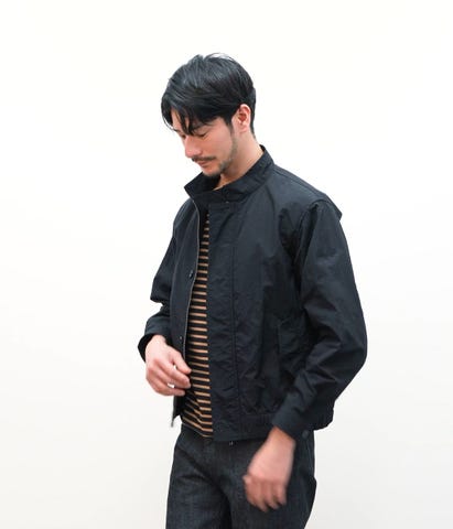 撥水機能のあるナイロン素材のハリントンアウター。シンプルなデザインの為、スタイルや季節を問わず活躍する1着です。