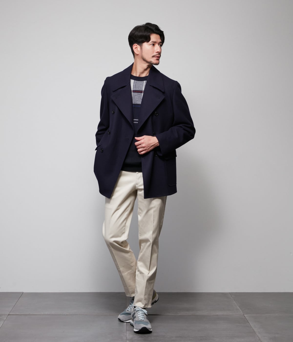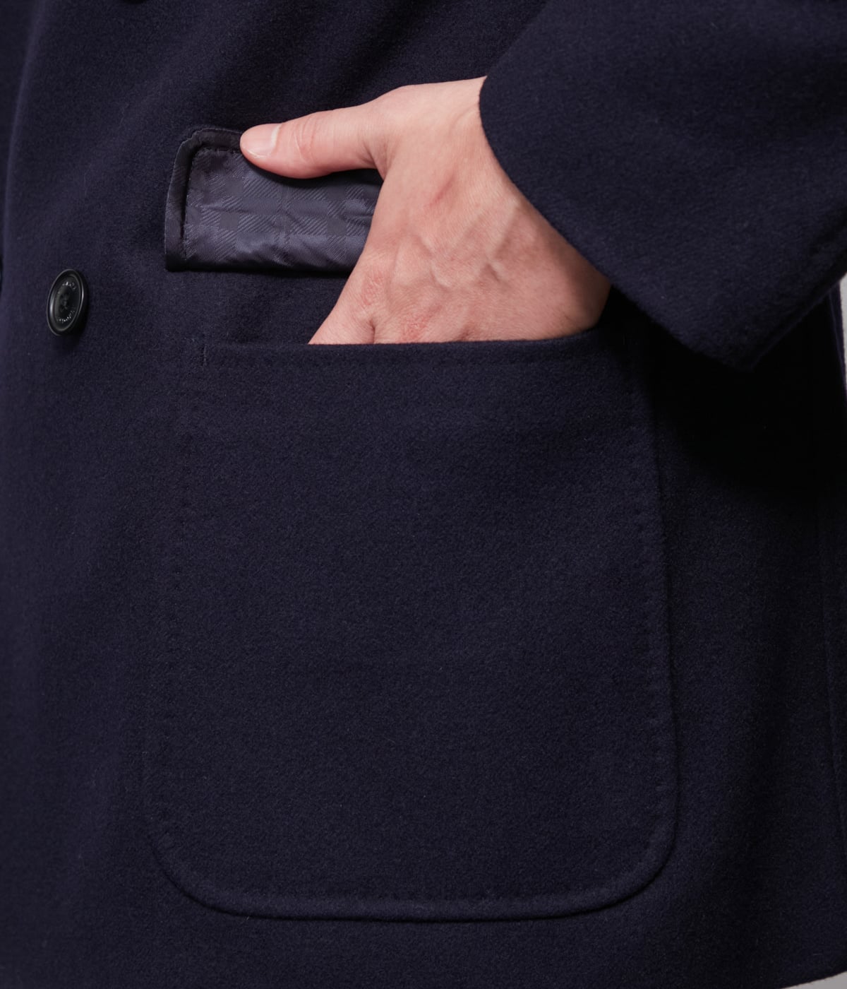メルトンシリーズの中で最も再現度の高いミドルタイプの肉感で作り上げたピーコート。アウター工場ではなく、敢えてジャケットを扱うテーラード工場で縫製し、テーラーメイクな仕上がりに拘りました。「テーラードピーコート」の名の通り、ラペルの返りの美しさが魅力の一つとなっています。フロントデザインは、左右同じ前合わせのリーファー仕様の段返りになっており、クラシックな要素も残しております。冬場の厚手のインナー着用を想定したゆったりめの着心地です。