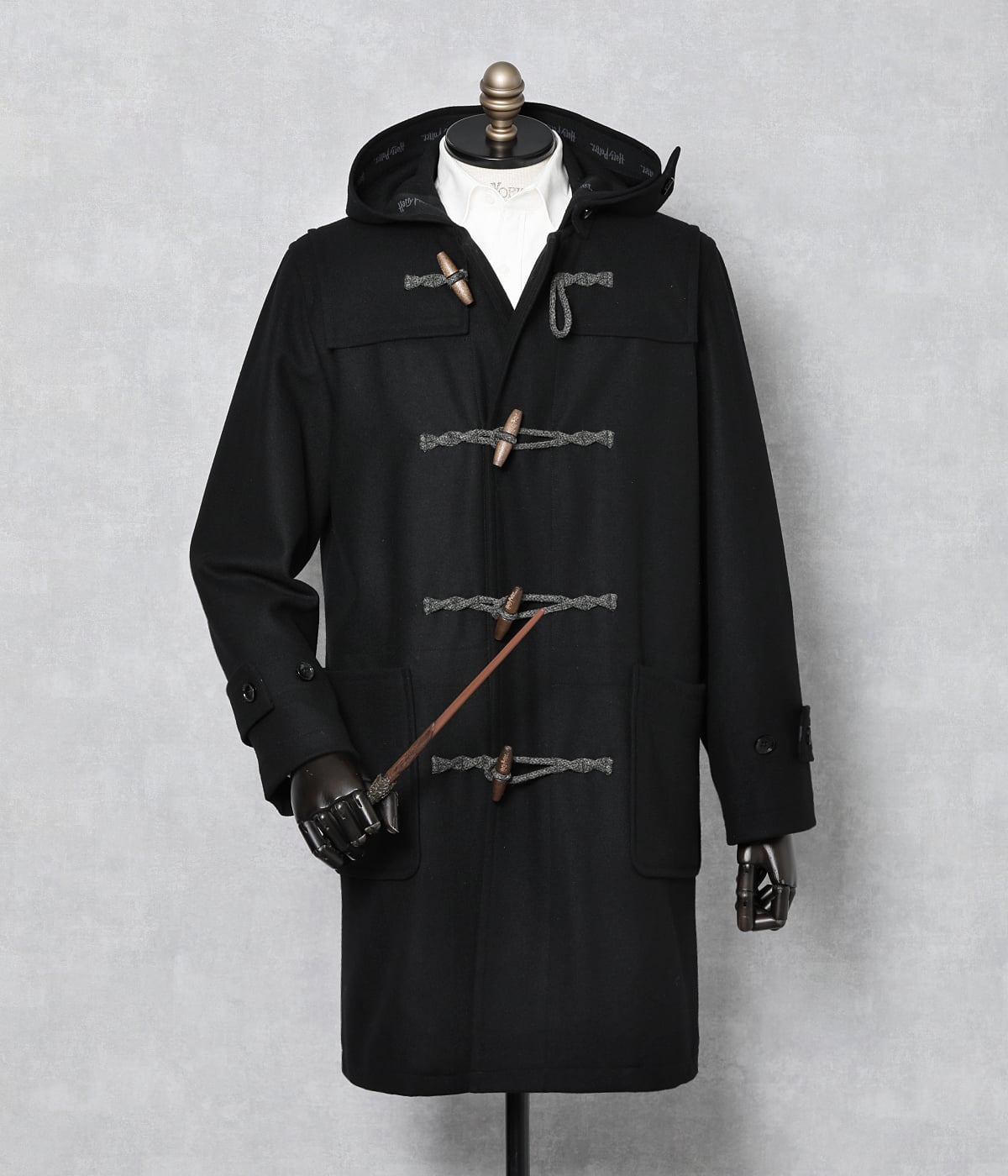 映画「ハリー・ポッター」シリーズに登場するローブを日常使いできるようにアレンジした黒無地のロングダッフルコート。麻紐、トグルボタン、大きめのフロントポケット、首元のチンストラップなど、クラシックなディテールを取り入れた伝統的なデザインです。ゆとりのあるゆったりとした着用感のため、冬場は厚手のニットなど着用しても着膨れせずインナーにも困りません。厚手のメルトンを使用しておりますが"肩で羽織る"型紙を採用しているため、着用時は軽く感じます。
