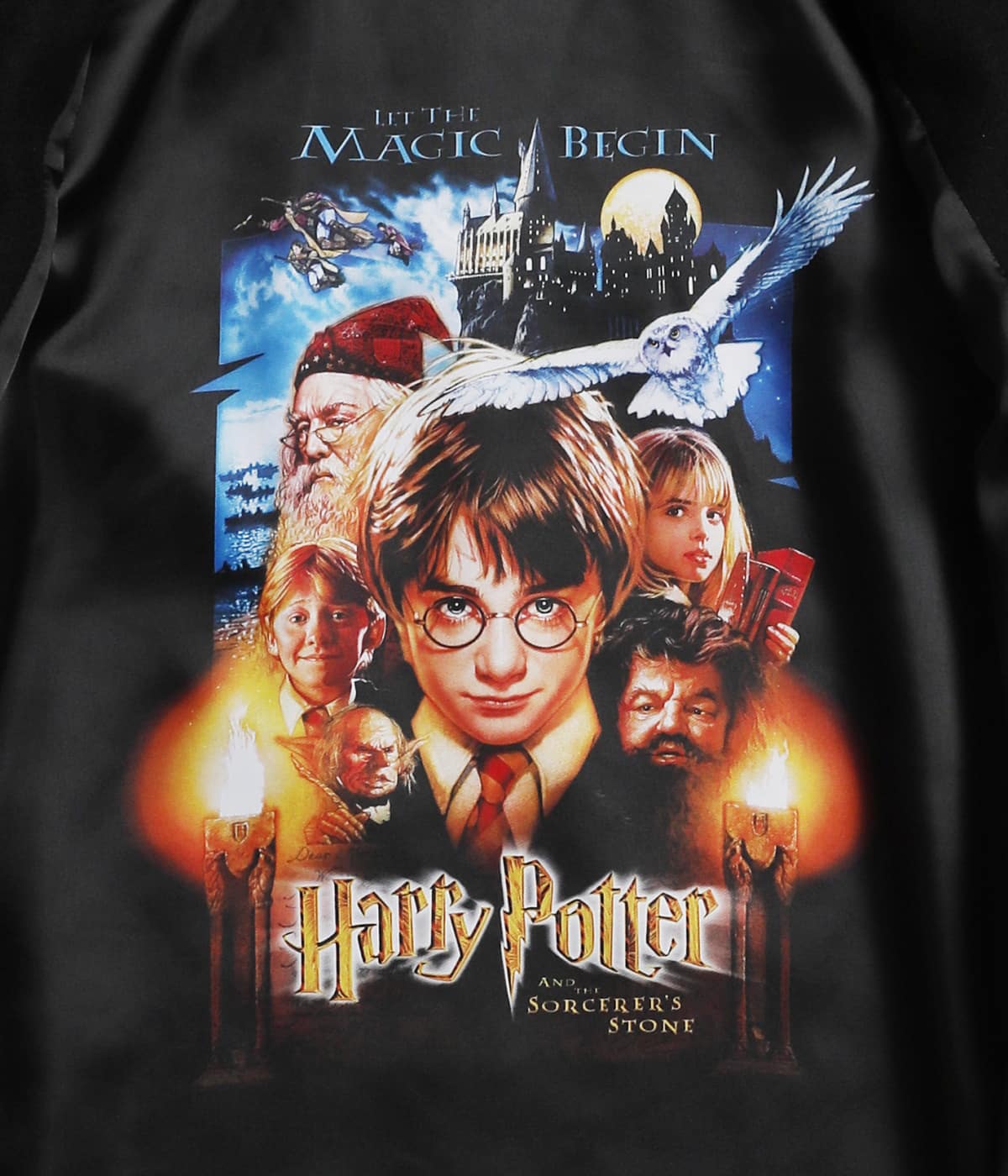 裏地に「ハリー・ポッターと賢者の石」のポスタープリントを配した大胆なデザイン。襟吊りには【Harry Potter】のロゴが刻印されたメタルプレート、フード裏・袖のアジャスター裏には【Harry Potter】のロゴ入り杉綾テープ、アンティーク加工を施した木製のトグル釦に【Harry Potter】のロゴを刻印して使用するなど細部にも拘った特別仕様です。左前立ての裏には、杖を収納できる専用のループ紐を完備しており、お気に入りの杖とお出かけできます。また付属パーツとして各寮のエンブレムワッペンが付くため、自分好みにカスタムすることもできます。