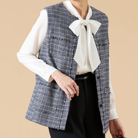 羽織るだけで一格上のスタイリングが叶う、華やぎツイードジレ。冬のコートインスタイルも、春はジレに替えて気分を更新。ニット×ワイドパンツの定番コーデに重ねるだけで、装いが一気に春らしくシフトします。