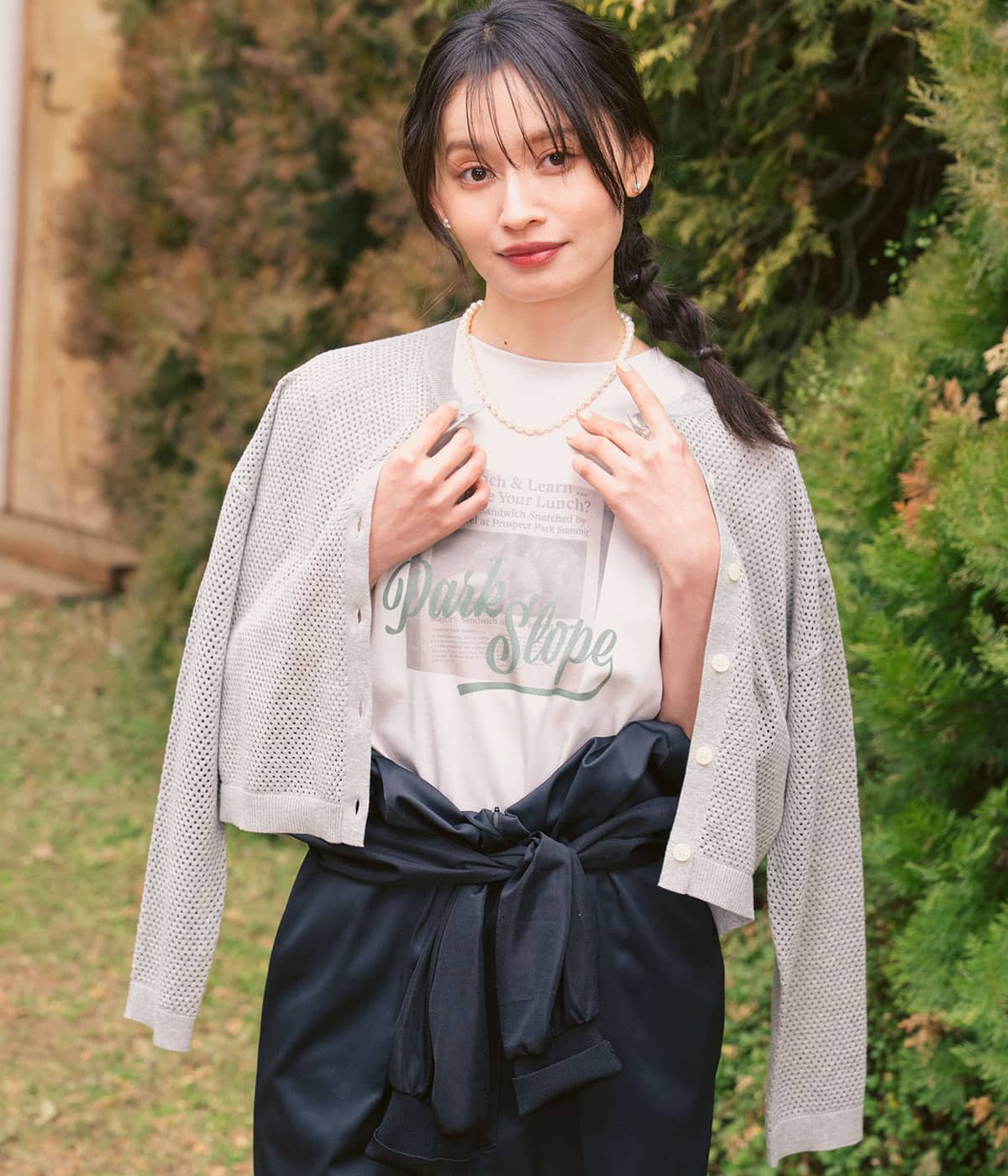 袖を腰に巻いて、バランスに変化を。カジュアルなプリントTに、メッシュカーディガンを重ねて軽やかに。女性らしいワイドなシルエットを活かしながら、力を抜いたスタイルへ。足元はスニーカーで、気負わない大人のカジュアルに。