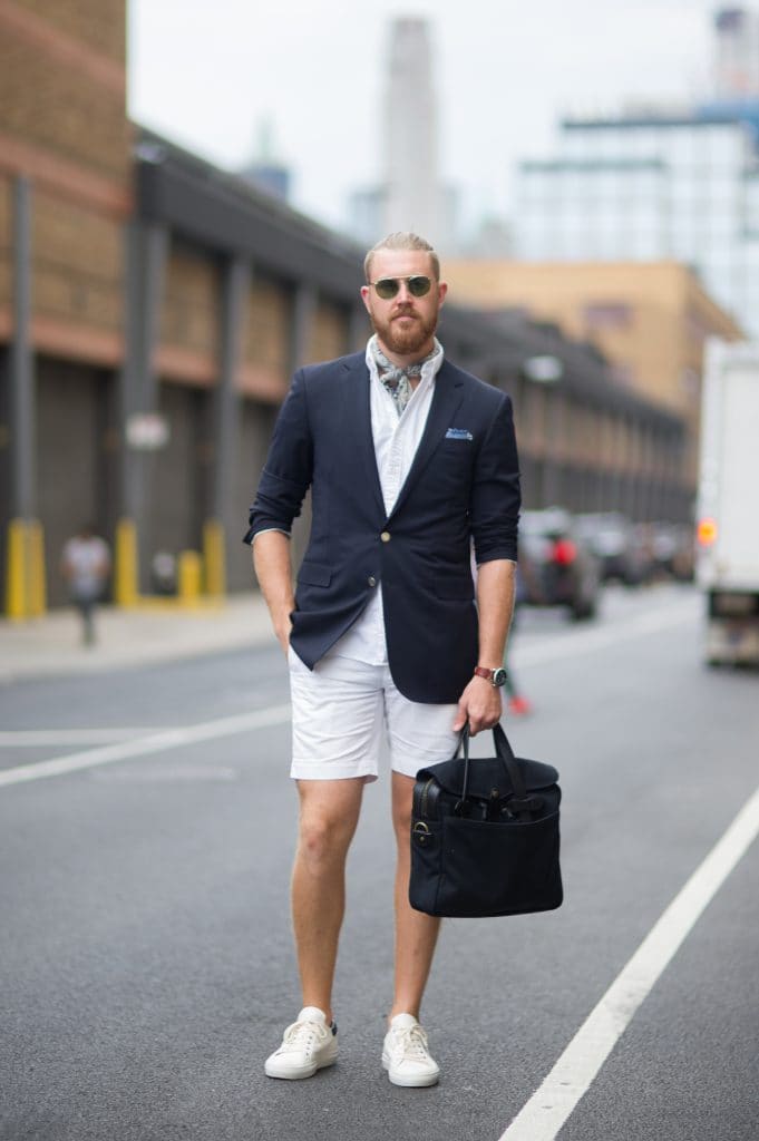 ラルフローレンのジャケットに、白シャツ、ショーツはともにJ.Crewのもの。彼もポケットチーフ、そして首元のスカーフなど、小物使いがポイント。