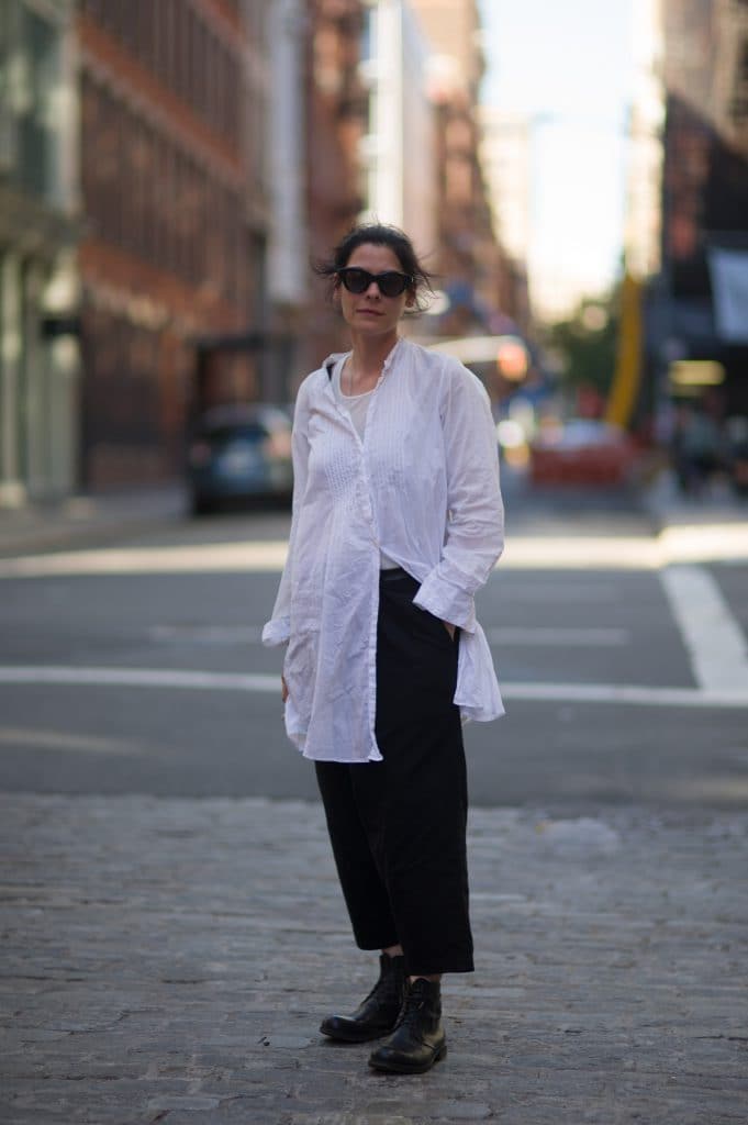 Ann Demeulemeesterのドレスシャツをドッレッシーになり過ぎないよう、ラフに着崩しています。男前のブーツは夫がハンドメイドで作製するイタリアのブランド、A1923のもの。