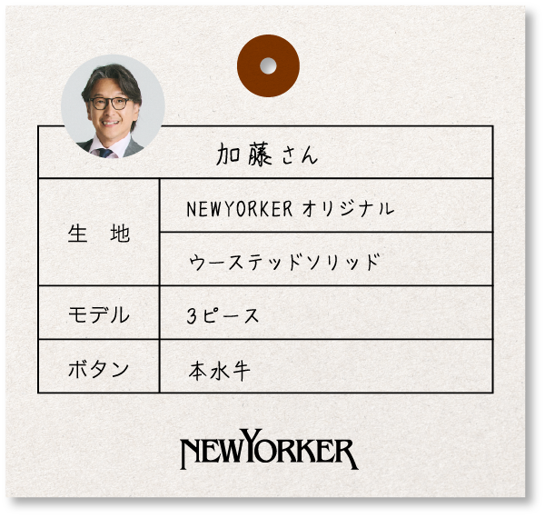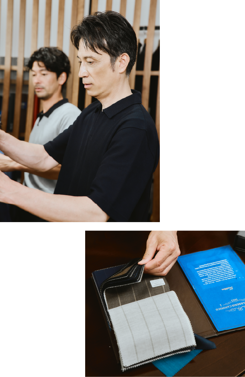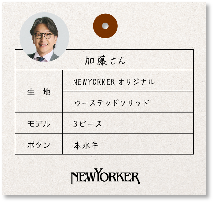 - 加藤さん 僕はスリーピースをオーダーしようと決めています。オーソドックスな生地は持ってるから仕立て映えするライトグレーかな。