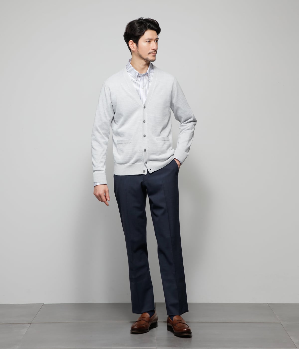 ノージャケット派の方におすすめなのがニットカーディガン。ジャケットに代わるきちんと感があり、タイドアップでもノーネクタイでも決まります。冷房による体温調節もでき、外気との温度差がある夏のオフィススタイルで重宝します。ダークカラーのスラックスで合わせる際は、明るいカラーのものを合わせると軽やかな印象に。