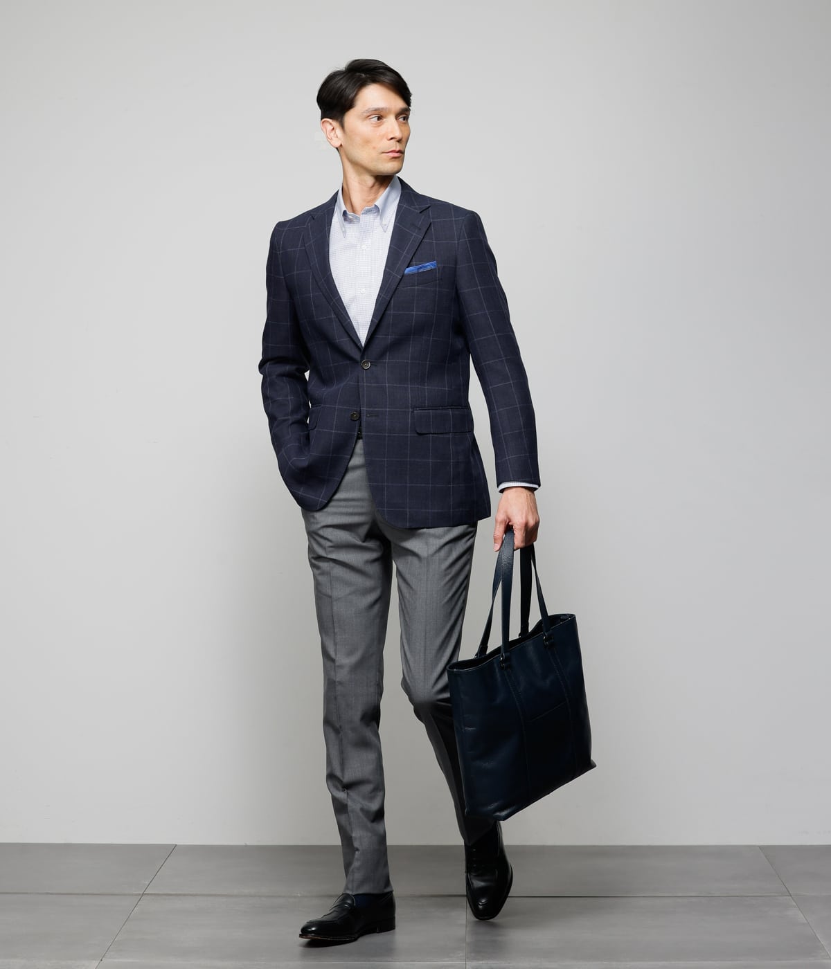 ネイビーとグレーは落ち着きを感じさせてくれ、 どちらも涼しげな寒色系であることからとても相性の良い色合わせです。ジャケットや小物をダークカラーで合わせた分、スラックスは春夏シーズンらしい明るいライトグレーをチョイスするのがポイント。