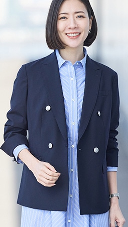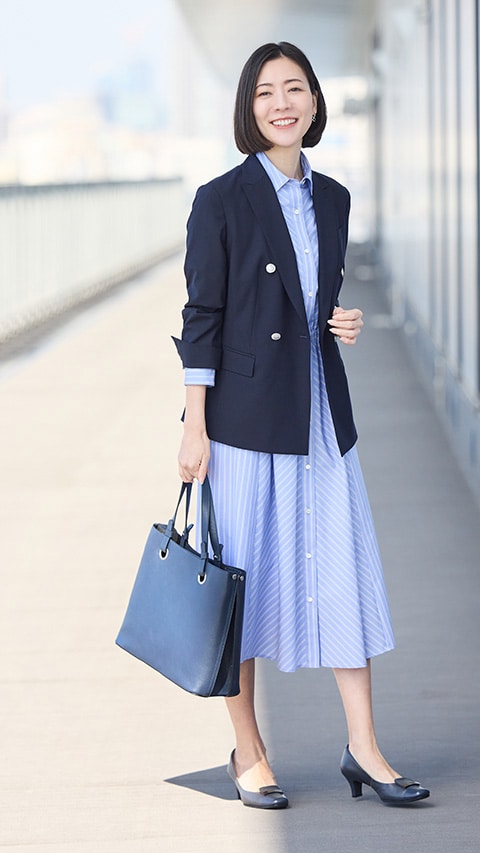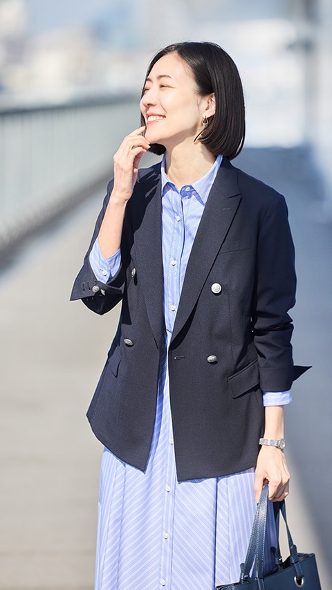 オンオフ兼用できるジャケットと言えば、絶対王者の紺ブレ一択。今年らしい旬な印象で着こなしたいなら、羽織るだけでこなれるダブルブレストが断然おすすめ。ストレッチ性と洗える機能性を備えているので、従来のブレザーよりも軽くて快適な着心地が魅力。また、メタルボタンや袖口の本切羽など、本格的なディテールが袖を通す度に背筋を伸ばしてくれる1着です。爽やかなシャツドレスにプラスすれば、春の雰囲気にぴったりのブレザーコーデの完成。