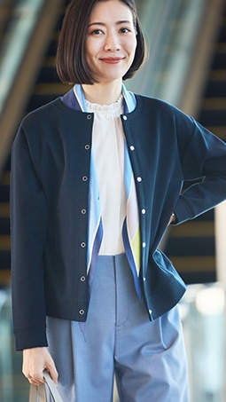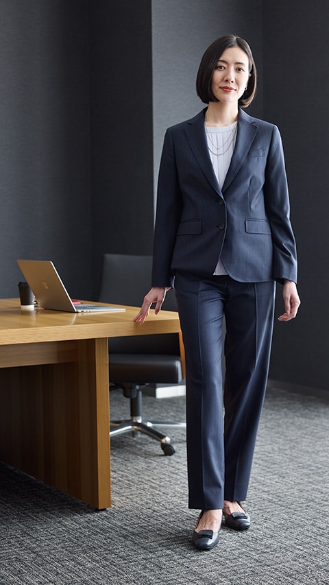 ウールシルクの梳毛セットアップはベーシックなシルエットながらも、上品な光沢が品よく映り、成熟した女性のビジネスシーンとも息ピッタリ。無地以上、柄未満のニュアンスのあるチョークストライプ柄なので、ほど良い着こなしのアクセントにも。インナーには真面目な印象のネイビーに華を添えてくれる、春らしいパープルのブラウスをセレクト。
