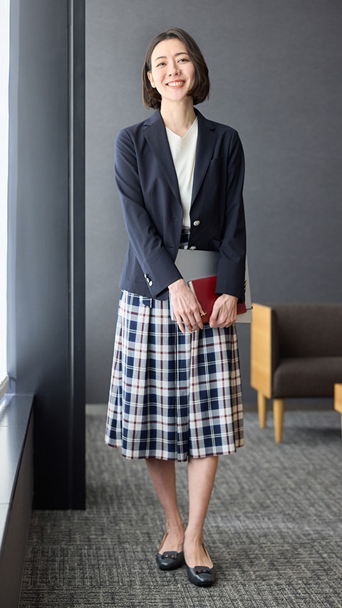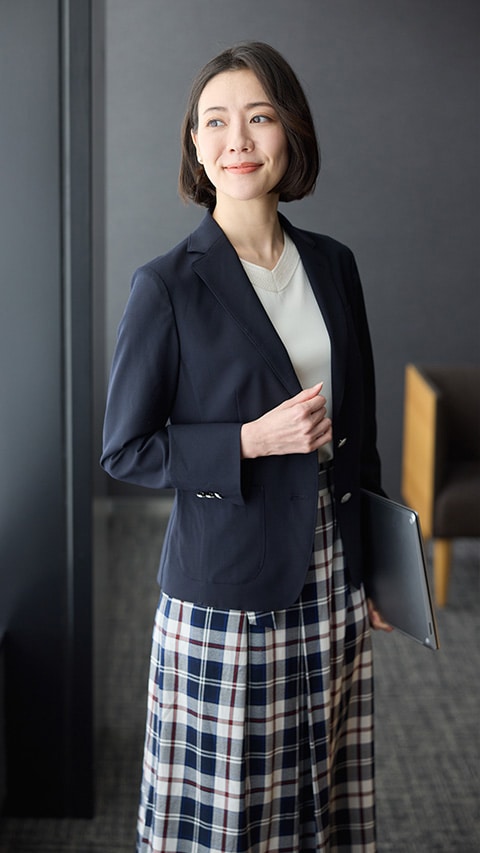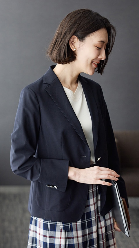 シングルの紺ブレ最大の強みは、トレンドに左右されずに長く楽しむことができること。ただ、合わせるアイテムや色合わせによっては、カジュアルになってしまうので注意が必要。ブレザーの色と合わせたニューヨーカータータン柄のスカート・ニットで色数少なく、品よくまとめるのがポイントです。ダブルブレストと同じく、ストレッチ性と洗える機能性に、メタル釦・袖口の本切羽など、オーセンティックなディテールが愛着を感じられる1着。
