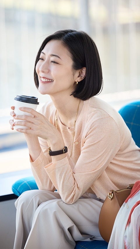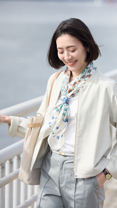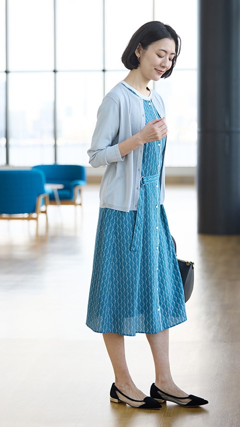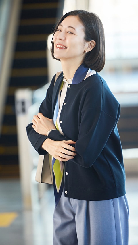 ほのかな光沢が美しいニットカーデならカジュアルになりすぎず、まるでブラウスのような品のある着こなしに。準備に忙しい朝でも、アンサンブルならスタイリングに悩まず即キマるも魅力のひとつ。また、サラリとしていてドライタッチな風合いなので、汗ばむ時期の羽織りとしても心強い1枚です。淡色に苦手意識のある方は、ボトムに色のコントラストを抑えたものをセレクトすると、こなれて見えてバランスも◎