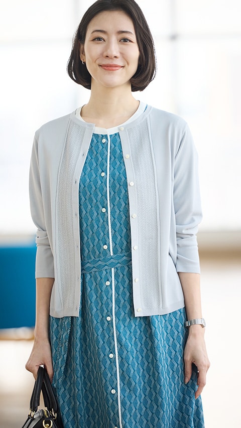 ワンピース×カーディガンの鉄板きれいめコーデ。シーズンレスで使えて無地にも柄にも寄り添ってくれる、やさしいライトグレーがポイント。フロントのレース編地が、さながらジャケットを羽織っているような、品のある佇まいに。取引先との食事会や懇親会など、好印象を与えたいシーンにもおすすめ。さらっとした落ち感のある素材なので、夏の冷房対策や日除けも担ってくれます。