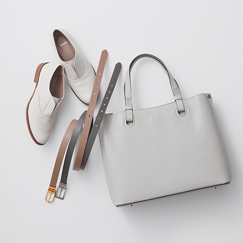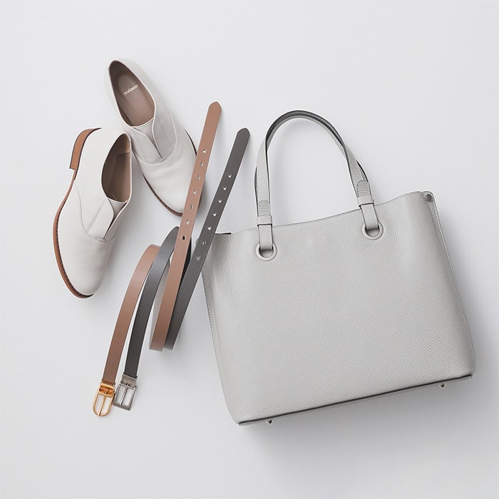 (左)オリジナルの木型で作成したレザースリッポン。オンオフ兼用できるミニマルな面持ち。(中央)リバーシブルで使用できるコスパ抜群な2wayベルト。(右)A4対応なのにスタイリッシュ。スーツスタイルにもばっちり。