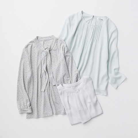(上)胸元のピンタックが上品なブラウス見えカットソー。(中央)繊細なドット柄×大人に似合うほど良いボウタイデザイン。(下)顔周りが華やぐフリルとタックディテール。ジャケットレスでも着映える頼れる1枚。
