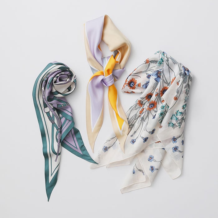 (左)ビットモチーフがクラシカルで上品な面持ち。初心者でも身に着けやすい形状も◎(中央)ビジネスシーンにもマッチする知的な幾何学模様。(右)春のムードたっぷりのフラワー柄。大判なので巻き方の幅も広がる。