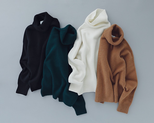 柔らかな風合いのラム100%ハイネックニットや、袖口のデザインが特徴的で