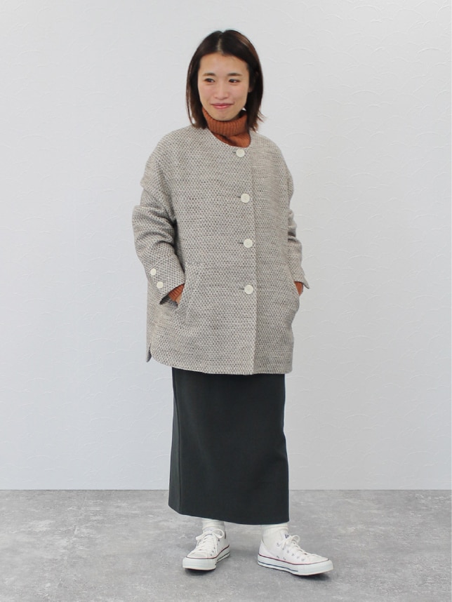 ノーカラーのコートなのでハイネックニットを合わせて、暖かみのあるコーディネートにしました。151㎝だと、お尻まで隠れる着丈です。 ツィード地でクラシカルなアイテムなので、あえてカジュアルなスニーカーを合わせてラフな着こなしにしてみました。ゆとりもあるので、厚手のニットや、重ね着もしやすそうですよ! |