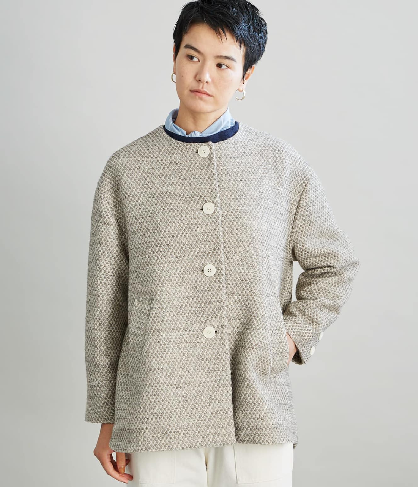 冬らしさを感じるツイードのオリジナルテキスタイルが魅力の一着。ツイードながら重さはなく、とても軽やかです。無染色の優しいカラーがとても合わせやすく、インナーや小物使いなど合わせるアイテムで雰囲気を変えられるコートだと思います。シルエットは全体的にゆったりしていて、首元もやや広めなので、私は襟のあるシャツやニットをインにした方が落ち着きました。 |