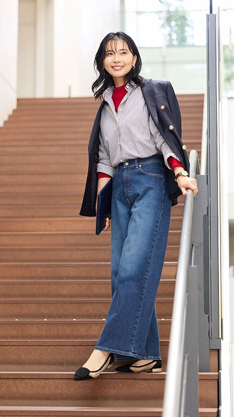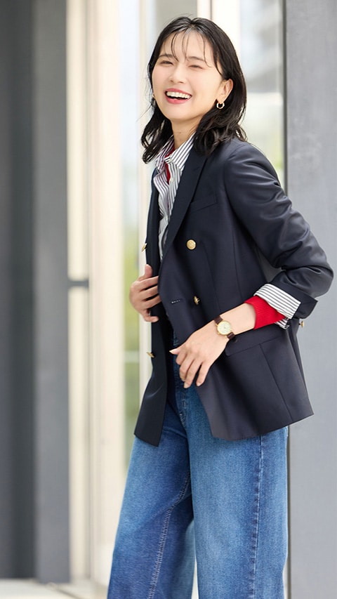ダブルブレストのブレザーに、ロンストシャツ+デニムを合わせた王道トラッドコーデ。そのまま着るとなんとなく古く見えがちですが、シャツの下に赤のニットを忍ばせれば、簡単に今の気分にアップデート。デニムを品よくまとめる力こそ、ブレザーならではの最大の魅力です。