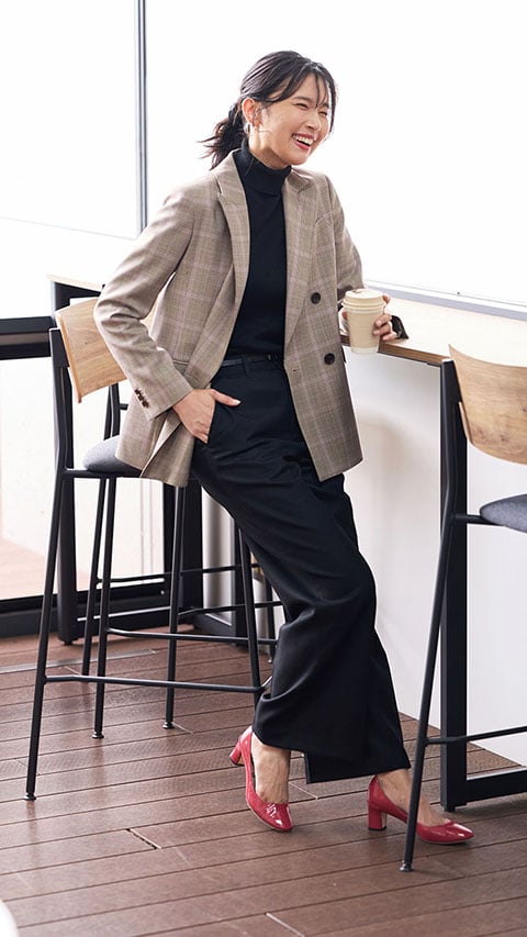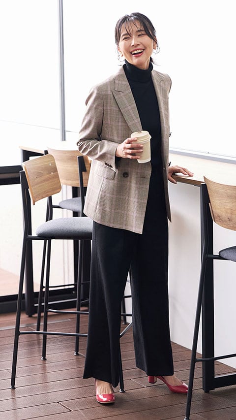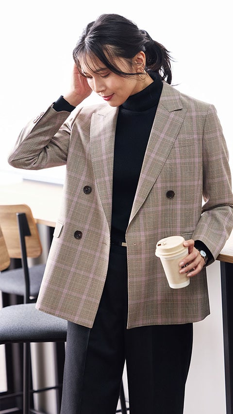 年々短くなる秋に頼れるのが、アウター代わりにもなる主役級ジャケット。ピークドラペルのダブルブレストに、マニッシュなグレンチェック柄をのせた1着は、羽織るだけで秋のムードを引き寄せます。インナーとボトムをブラックで統一してハンサムに仕上げれば、オフィスでも浮かない端正なジャケットスタイルの完成。