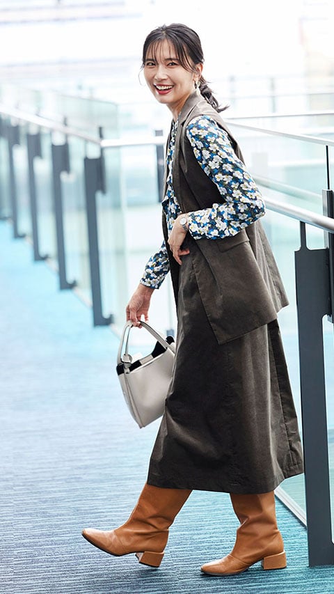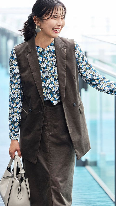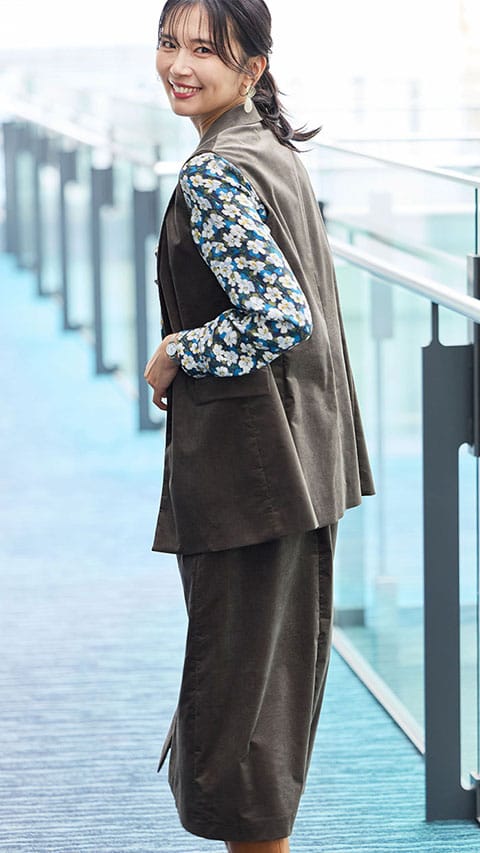 定番のセットアップスタイルに飽きたら、ジレセットアップにシフトして鮮度アップを。袖の無いジレなら残暑の厳しい秋口から、いち早く秋映えコーデが楽しめてマンネリ知らず。インナーには総柄のフラワープリントブラウスを差し込んで、ほどよく華やぎをプラスするのがおすすめです。