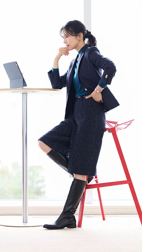 定番のシングルブレザーに、カラーニットとショートパンツを合わせたNEWトラッドスタイル。ジャケットなのに堅くなりすぎず、ショートパンツもきちんと決まる絶妙なバランスは、ミニマムなシルエットの紺ブレならでは。もしショートパンツに抵抗があるなら、ロングブーツで肌見せを控えめにすると大人にも馴染みます。