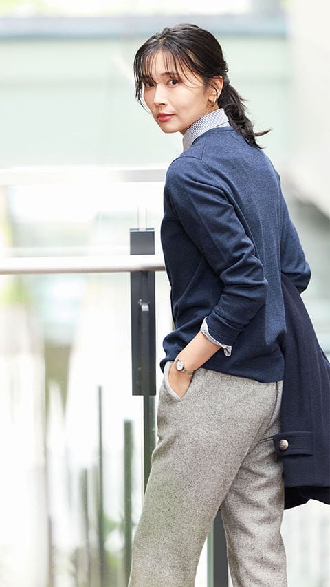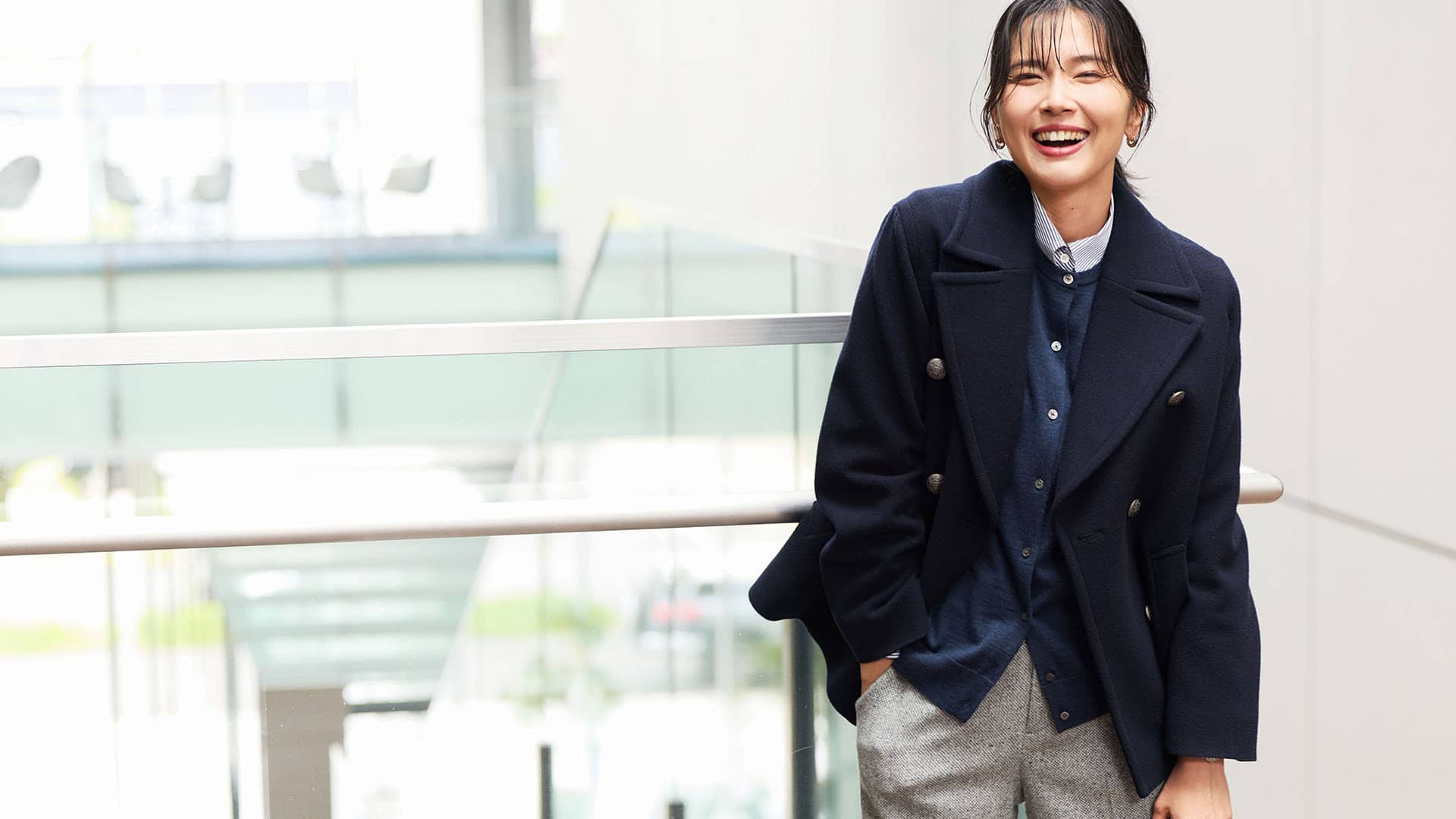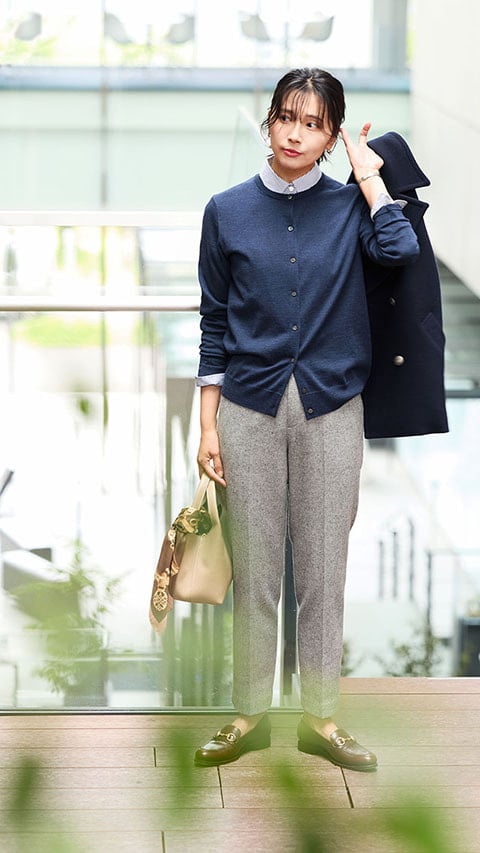 忙しい朝も迷わず手に取りたくなる、信頼の上質ベーシックコーデ。ピーコートはラムウール100%の素材の良さと、美しいシルエットで大人の品格を感じさせて。ジャケット未満のきちんと感を叶えてくれるネイビーのカーディガンは、1枚持っていれば大抵のスタイリングを解決してくれる冬の最適解アイテムです。