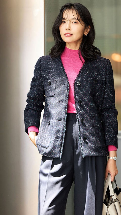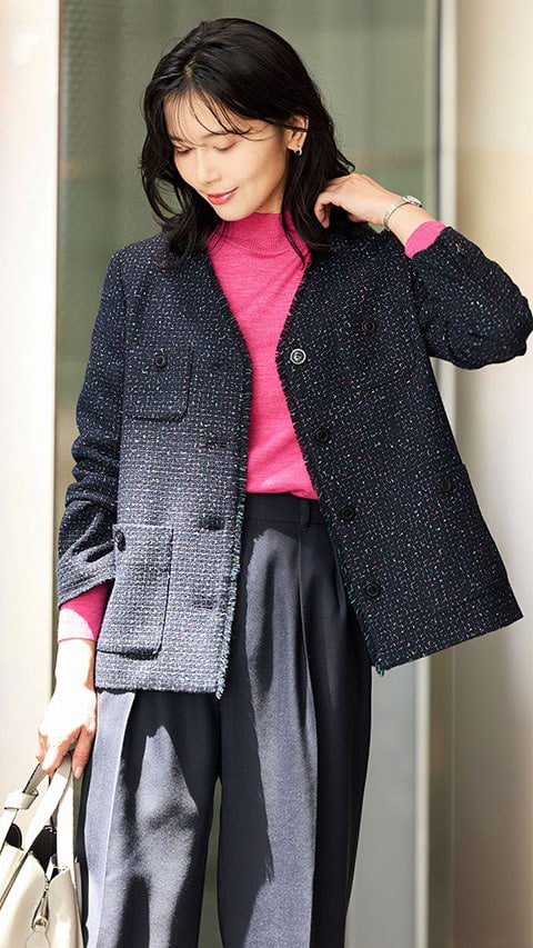 大人の“さじ加減”が光るツィードジャケットは、ネオンカラーの糸を織り交ぜることでさりげなく華やぎを演出。かっちりしすぎず軽やかに羽織れるので、コート前のアウター代わりにもおすすめのアイテムです。ピンクのニットを差し色に、ネイビーのワイドパンツで品よくまとめれば、オフィスでも浮かずに、自分らしいお洒落を楽しめるバランスに。