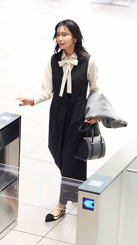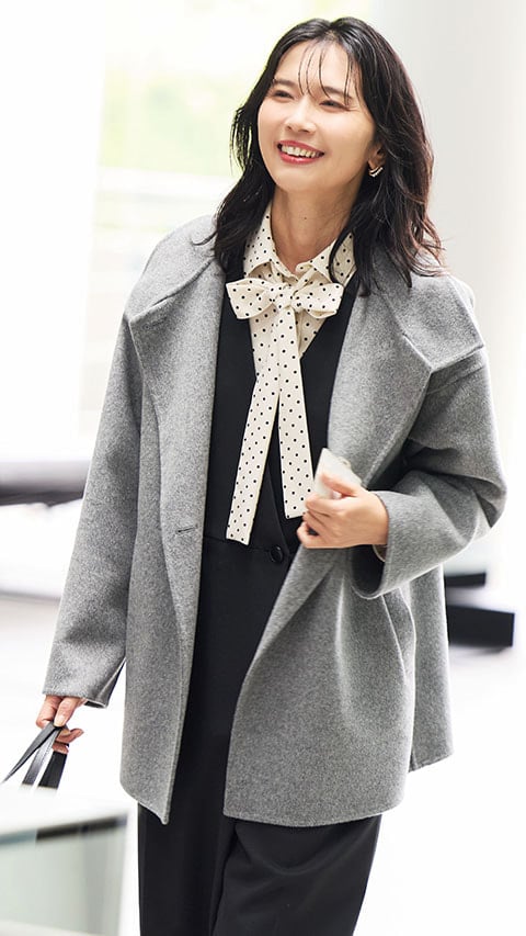 社内行事や退勤後の予定にもそのまま出かけられる、頼れるきれいめカジュアル。黒のオールインワンを取り入れて、きちんと見えてほどよく華やぐ、オフィスカジュアルの理想形にアップデート。さらに、ボウタイブラウスを重ねて、年末年始にもぴったりのクラシックなムードをひとさじ。グレーのコートをプラスすれば、堅すぎず上品なバランスが完成します。