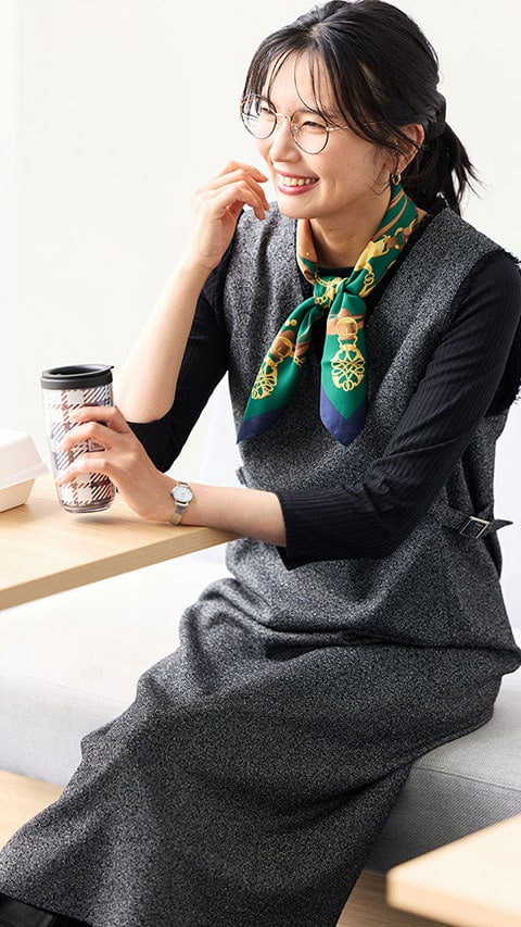 バタバタする朝も、ツイードジャンスカがあれば悩ましいコーデが即完成。品のある素材とフリンジやベルトディテールの抜け感で、大人の品の良さを引き立てます。首元にはビット柄スカーフを、アウターにロングコートを合わせれば、手抜き感ゼロの今っぽスタイルに。“考えずにお洒落が決まる”理想の時短コーデです。