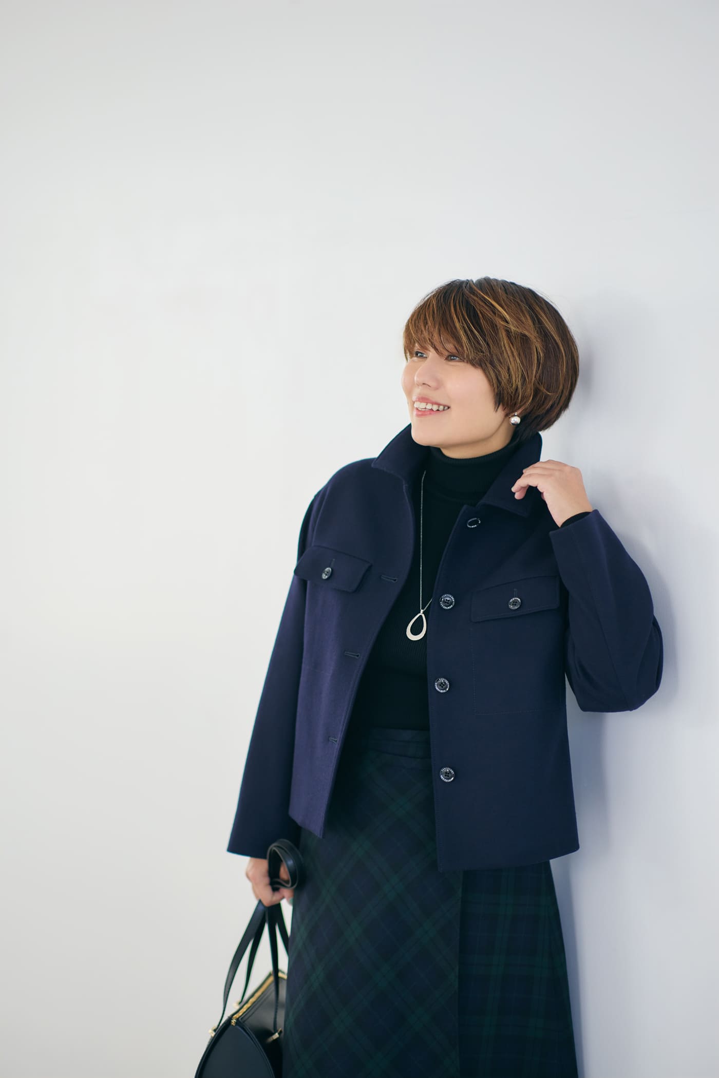 ジャケットとコートの間のニュートラルなアウターです。すごく品の良いネイビーなので、きちんと感があって、こんな感じで襟を寝かせて着ても、とてもきれいに決まります。