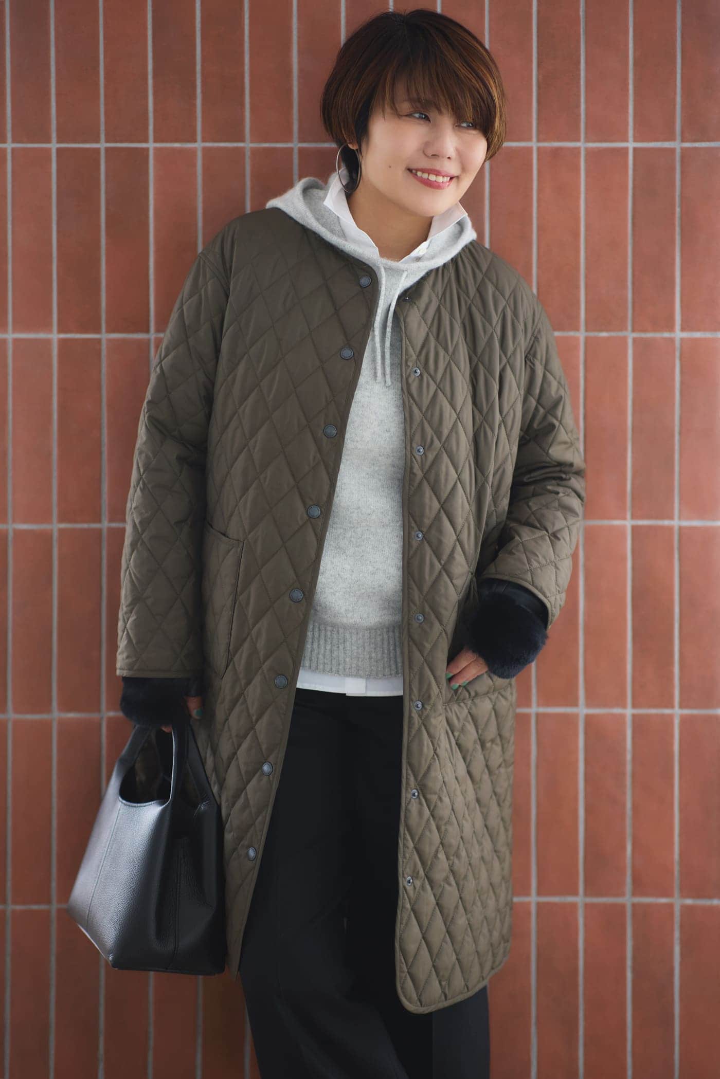 今シーズン、キルティングアウターはとても人気。軽くてエアリーで、とても素敵なんですけど、ちょっとカジュアル度が高いっていうのが、むずかしいと思われる方も多いかなと思います。そういうときは、白シャツやセンタープレスのパンツを合わせていただくと、大人っぽく着こなせます。もちろん、デニムでラフに合わせても◎。指先の空いたグローブなどの小物をプラスすると、こなれた雰囲気で楽しんでいただけると思います。